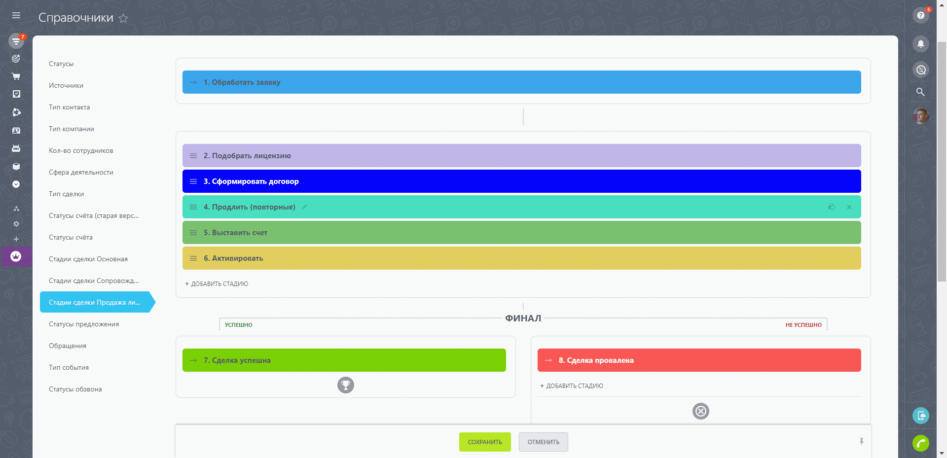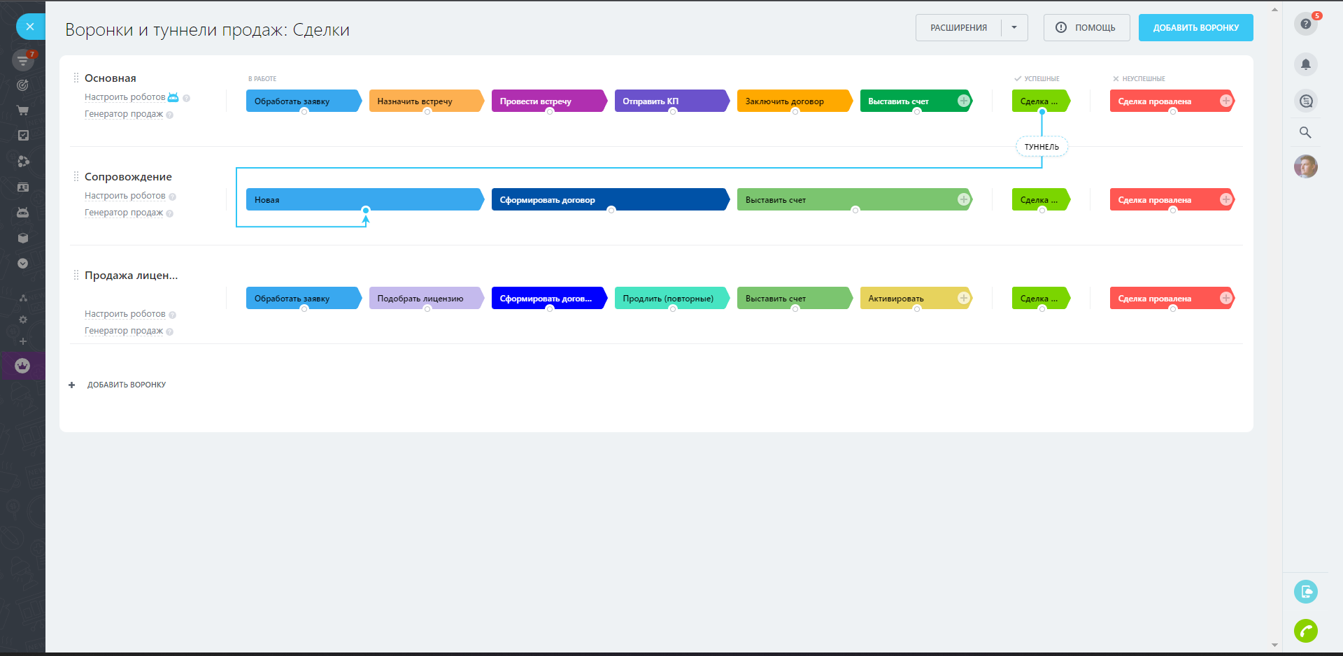 Помимо лидов мы настроили три направления сделок: «Основная», «Сопровождение», «Продажа лицензий». Стадии сделок во всех воронках в основном имею названия в виде призыва к действию. Сделано специально, чтобы воронка была своеобразной картой дальнейших действий и ориентира, что делать, для менеджера. На стадиях установлены роботы и триггеры для экономии времени менеджера от рутинных процессов.