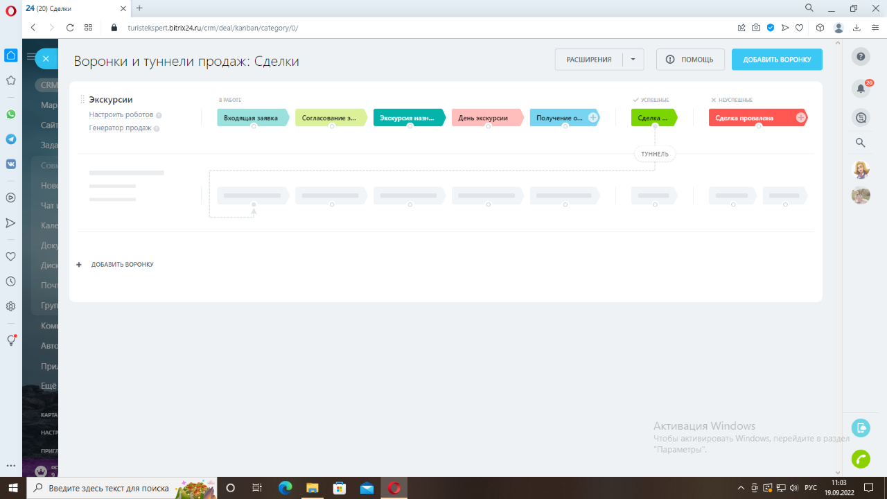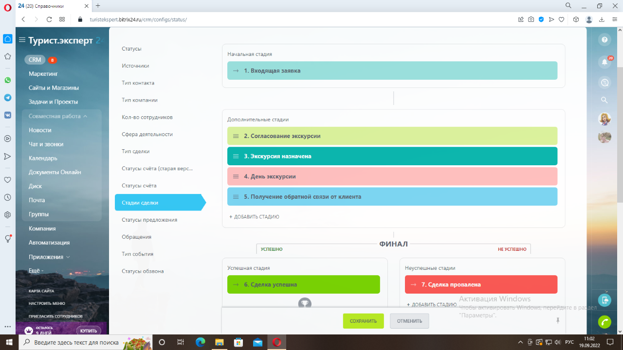 День экскурсии – на данной стадии находятся все сделки, которые запланированы на сегодня. Также приходит уведомление-напоминание ответственному гиду, о том, что у него запланирована экскурсия через 2 часа.