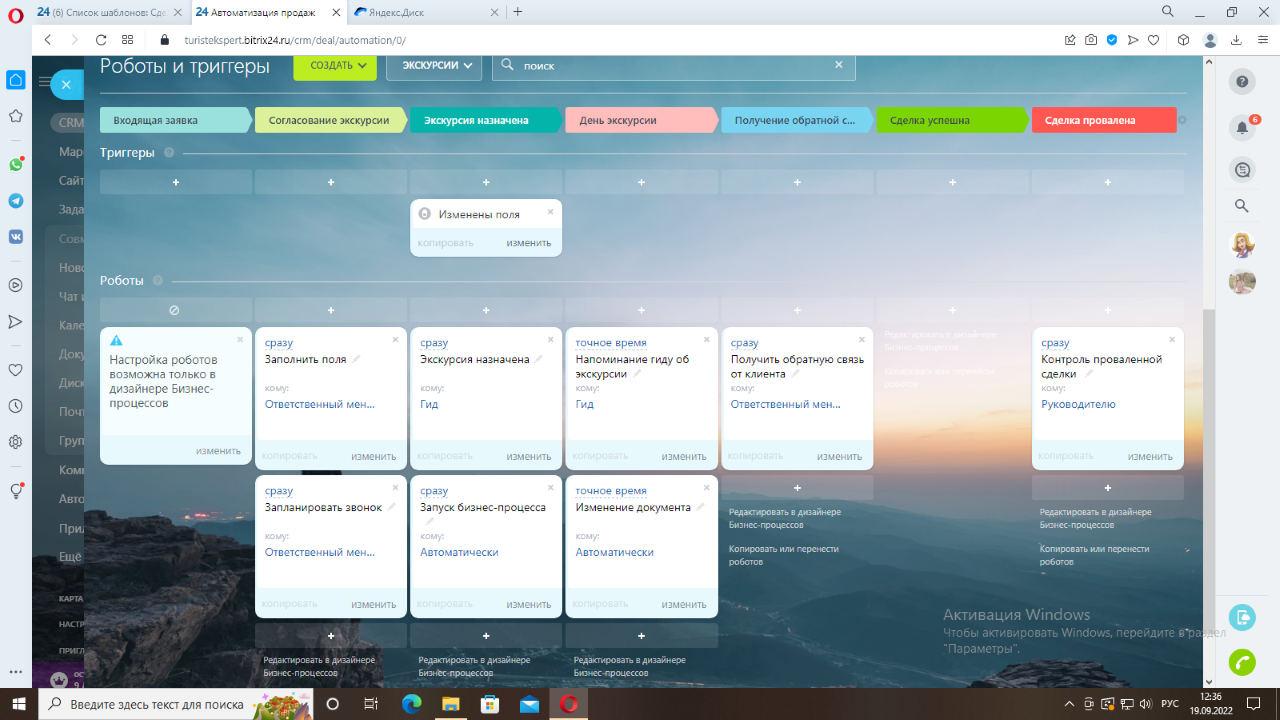 - написали 2 бизнес-процесса: для автоматического переноса карточки сделки на стадию «день экскурсии», считывая поле дата; и для заполнения полей по выбору нужной экскурсии.