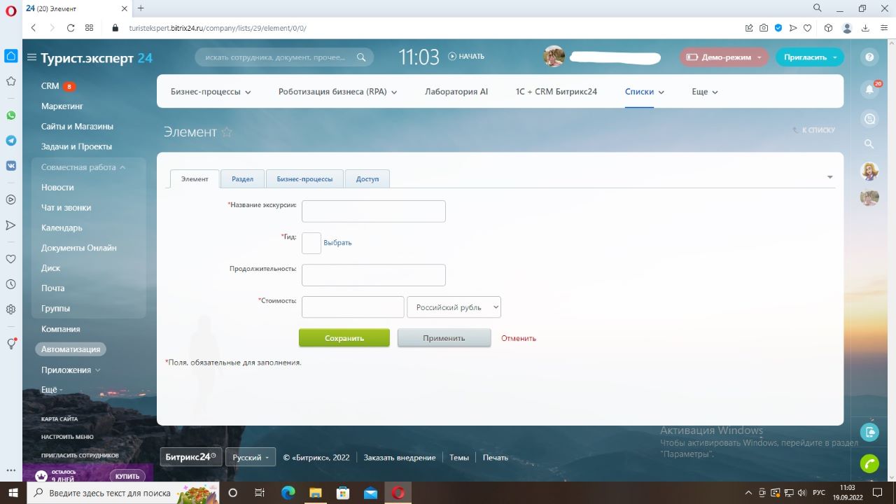 Согласование экскурсии – после того, как менеджер взял заявку в работу и перевел карточку на эту стадию, ему необходимо заполнить поля «Экскурсия» и «Дата экскурсии». Список экскурсий можно будет добавить во вкладке «Списки», заполнив необходимые поля (стоимость, продолжительность и гида, который будет проводить данную экскурсию), см. скриншоты и описание ниже. Таким образом, менеджеру не нужно будет запоминать стоимость или продолжительность той или иной экскурсии. После выбора экскурсии из списка, все поля автоматически заполнятся.