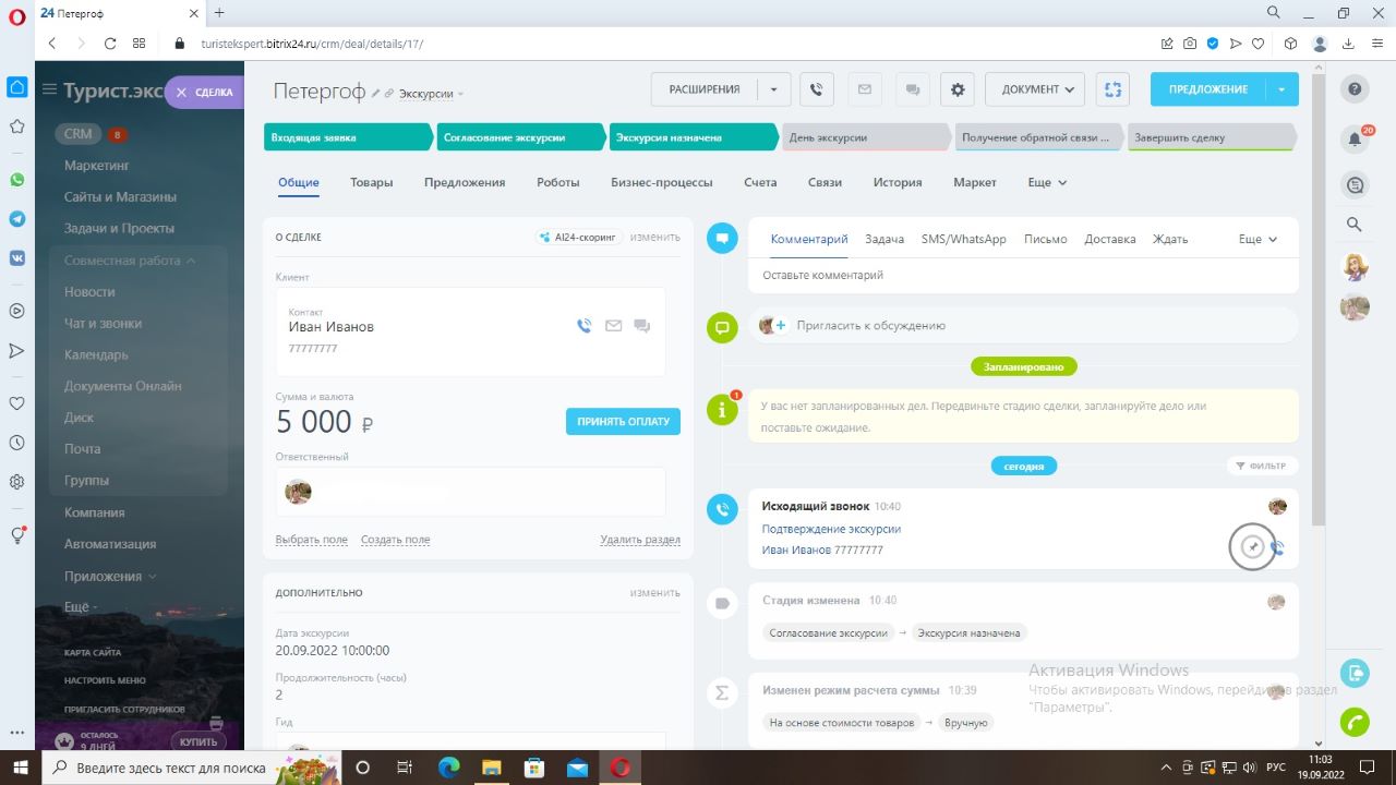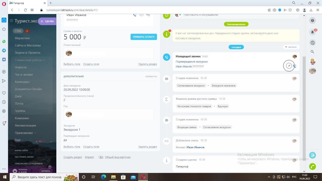 Экскурсия назначена – после перехода карточки на данную стадию приходит уведомление указанному гиду о дате и месте экскурсии. Карточка на данной стадии остается «ждать» до даты экскурсии, указанной в сделке. После чего с помощью бизнес-процесса переводится на следующую стадию «День экскурсии». Это удобно, так как менеджеру не придется отслеживать каждую карточку и переводить вручную. Можно наглядно увидеть, какие экскурсии назначены на сегодня и во сколько.