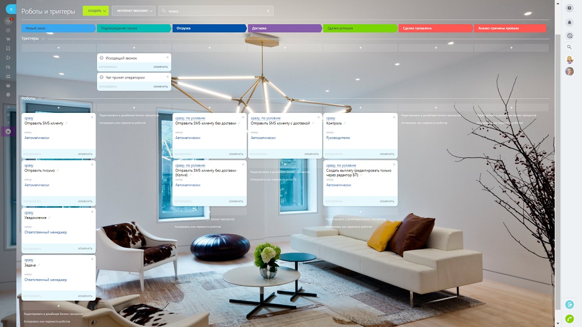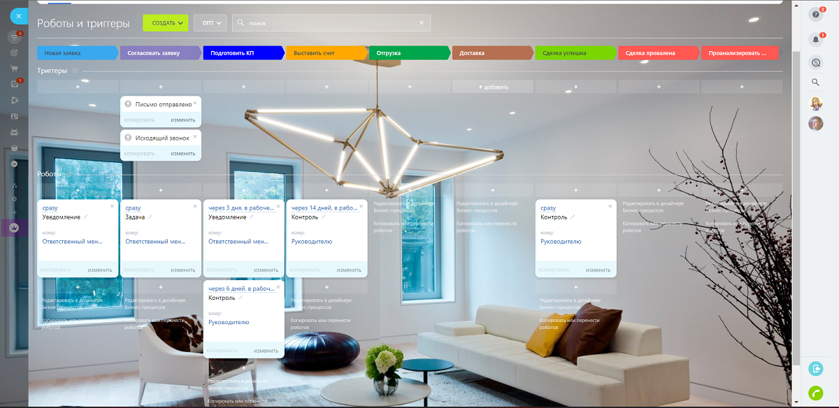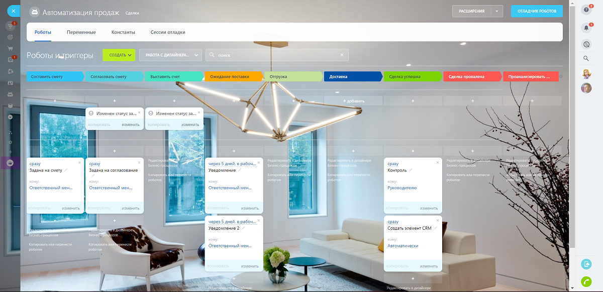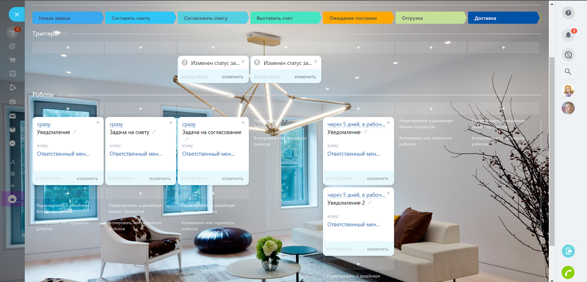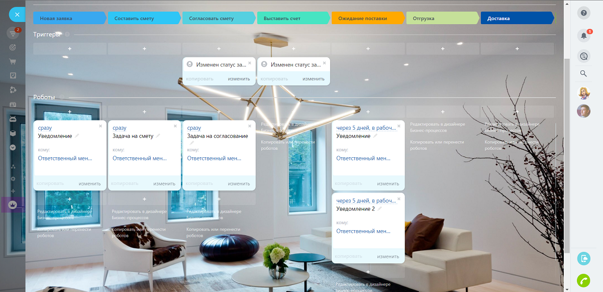 Ожидание поставки – так как работа с дизайнерами, чаще всего предполагает уникальный подбор под каждый объект, мы предусмотрели стадию, когда вам придется заказывать товар, которого нет в наличии. Возможно даже товар отсутствует в вашей товарной матрице. Для вашего удобства мы написали на этой стадии два робота уведомлений, чтобы вы не забывали мониторить поставку товара для заказа.