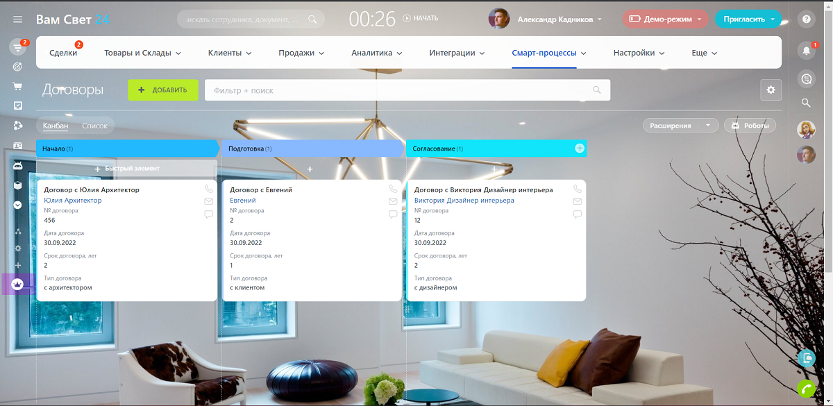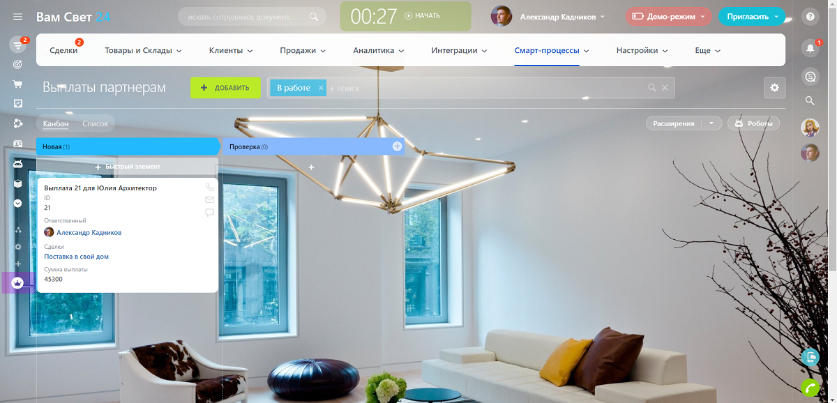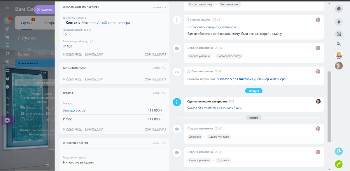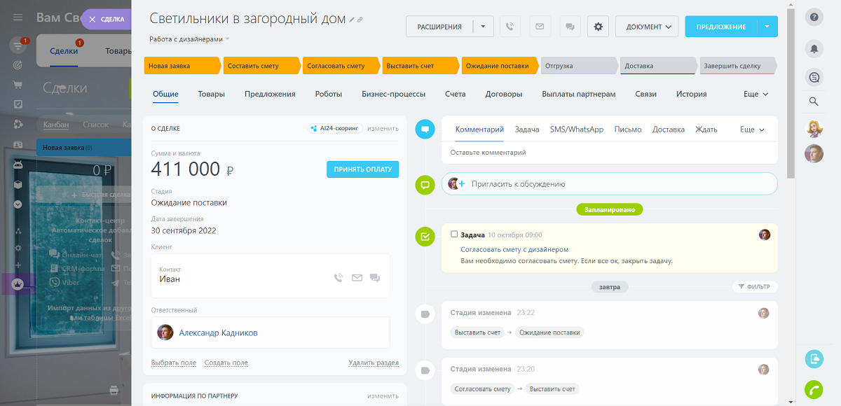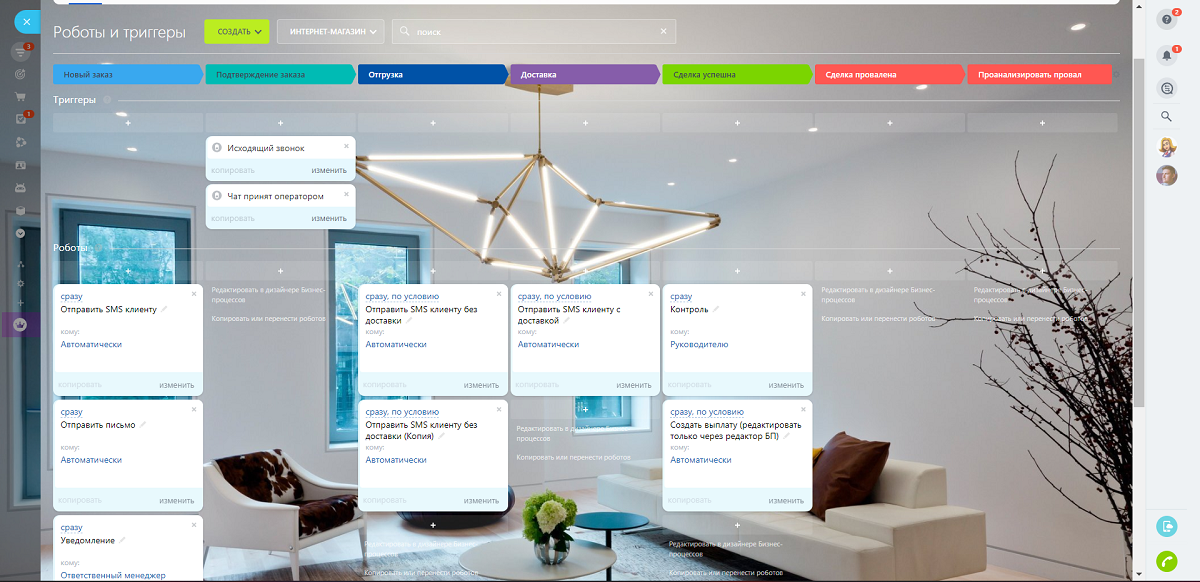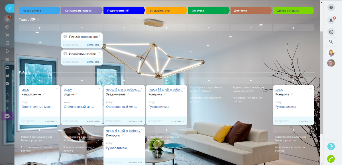Ожидание поставки – так как работа с дизайнерами, чаще всего предполагает уникальный подбор под каждый объект, мы предусмотрели стадию, когда вам придется заказывать товар, которого нет в наличии. Возможно даже товар отсутствует в вашей товарной матрице. Для вашего удобства мы написали на этой стадии два робота уведомлений, чтобы вы не забывали мониторить поставку товара для заказа.