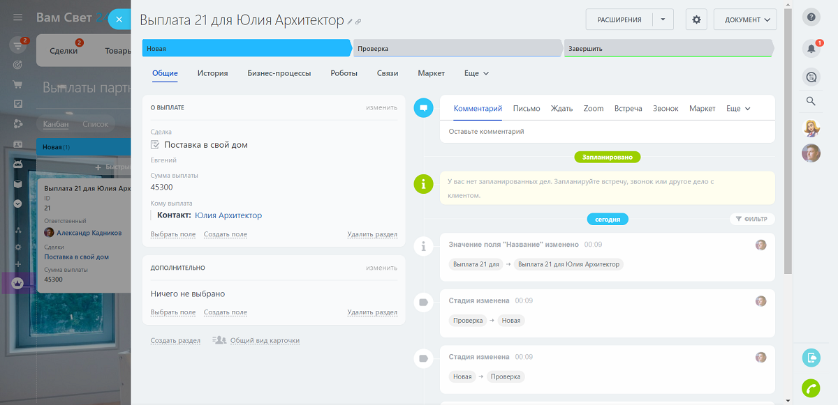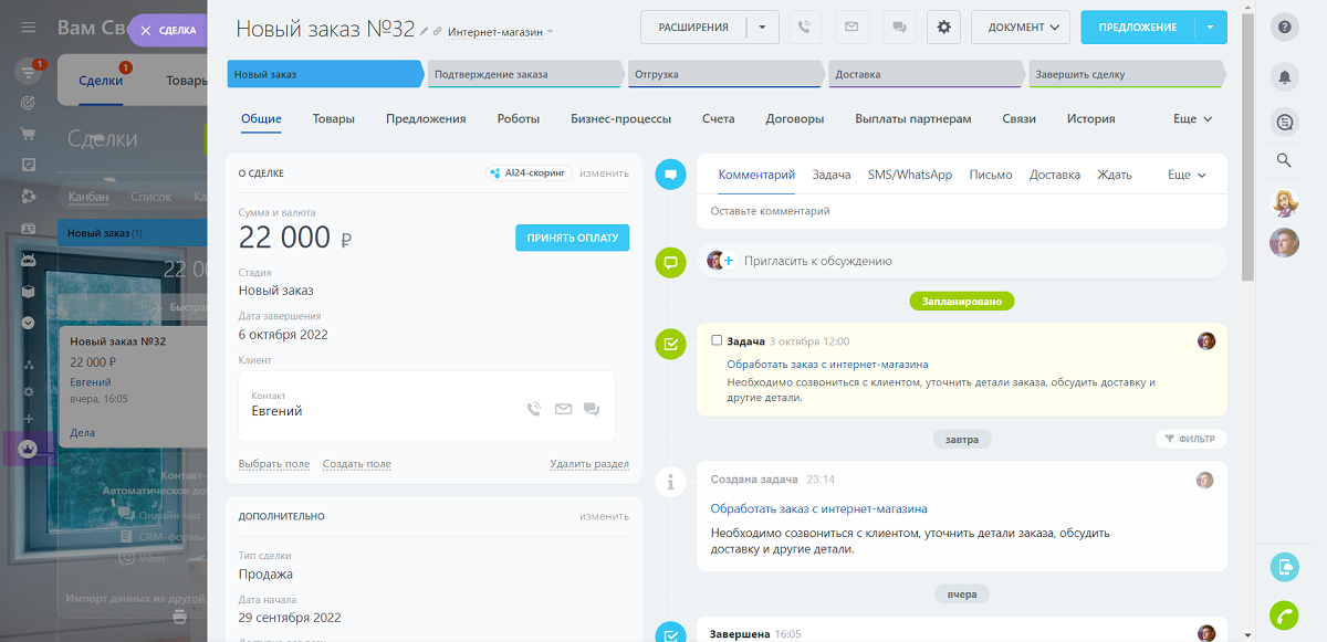 Новая заказ – на эту стадию попадают все заказы с интернет-магазина, по которым менеджер должен подтвердить заказ. Созвониться или написать клиенту. Для увеличения эффективности работы менеджеров мы добавили роботов. Роботы автоматически отправляют email и смс клиенту о том, что заказ получен. Роботы отправляют уведомление менеджеру о новом заказе и ставят задачу обработать заказ.