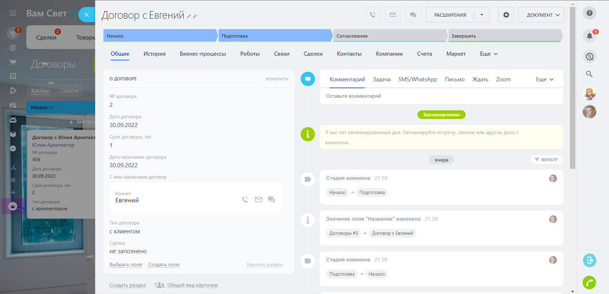 Согласовать смету – на эту стадию сделка попадает автоматически, если закрыта задача на формирование сметы, созданная на предыдущей стадии. Иначе менеджер переносит сделку вручную. При переходе на эту стадию ставится задача на согласование сметы.
