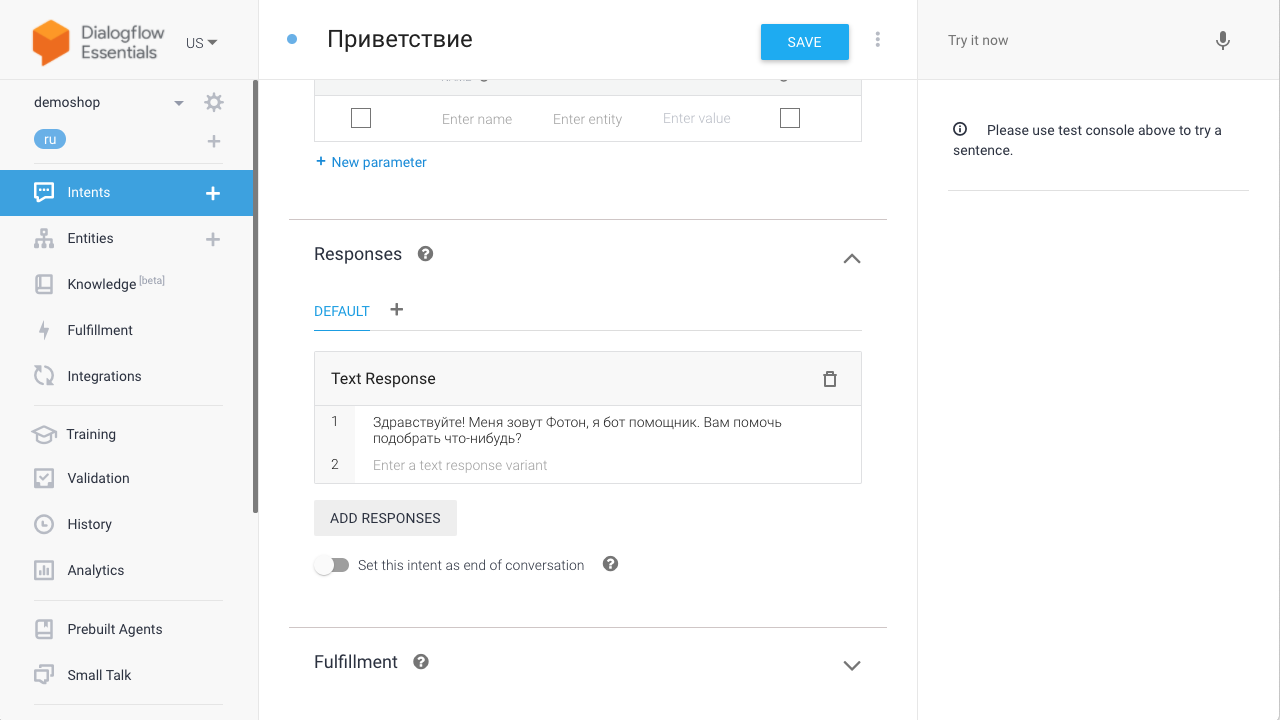 Обучение чат-ботов на стороне сервиса Dialogflow. Обучение производится путем создания интентов (Intents), которые состоят из обучаемых фраз и ответов на них.