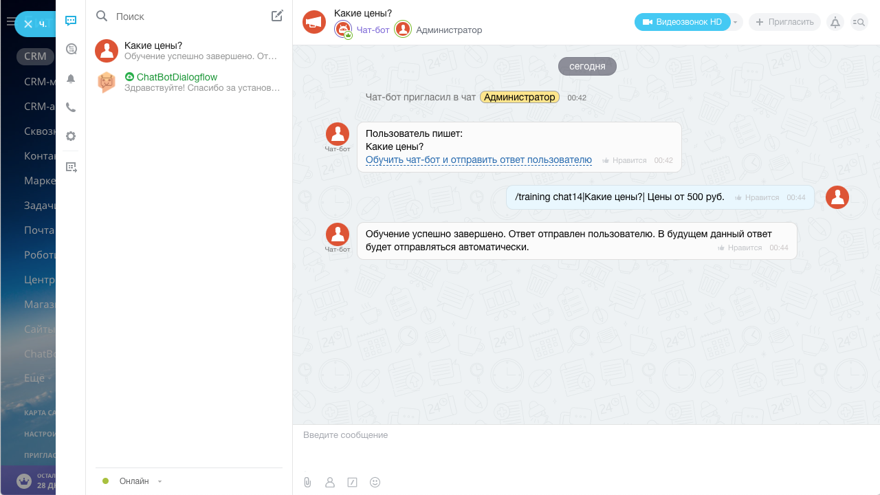 Обучение чат-ботов операторами открытой линии в чате Битрикс24. Если в Dialogflow не находится нужного ответа, то чат-ботом создается отдельный чат в Битрикс24 с операторами из очереди открытой линии, и отправляется в него фраза для обучения. Операторы могут отправить ответ с помощью заданной команды. Ответ отправляется пользователю и создается новый интент в Dialogflow, включающий фразу для обучения и ответ от оператора.