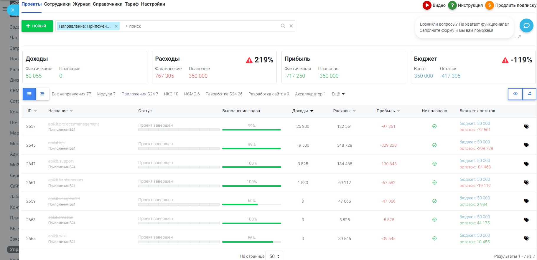 Приложение упрощает систему учета и мониторинга работы и выводит бюджетную статистику по проектам в одном окне. Реализована выгрузка отчетов в Excel.