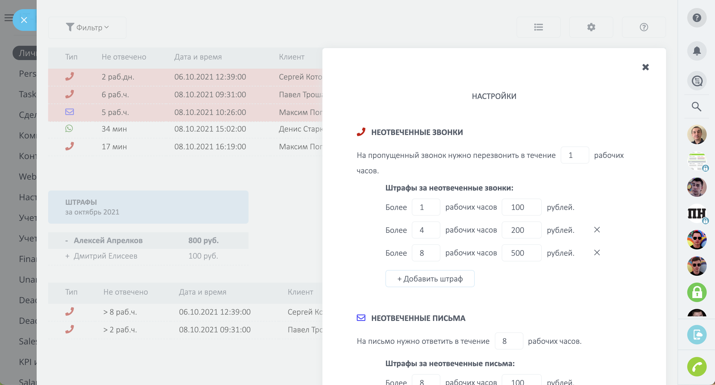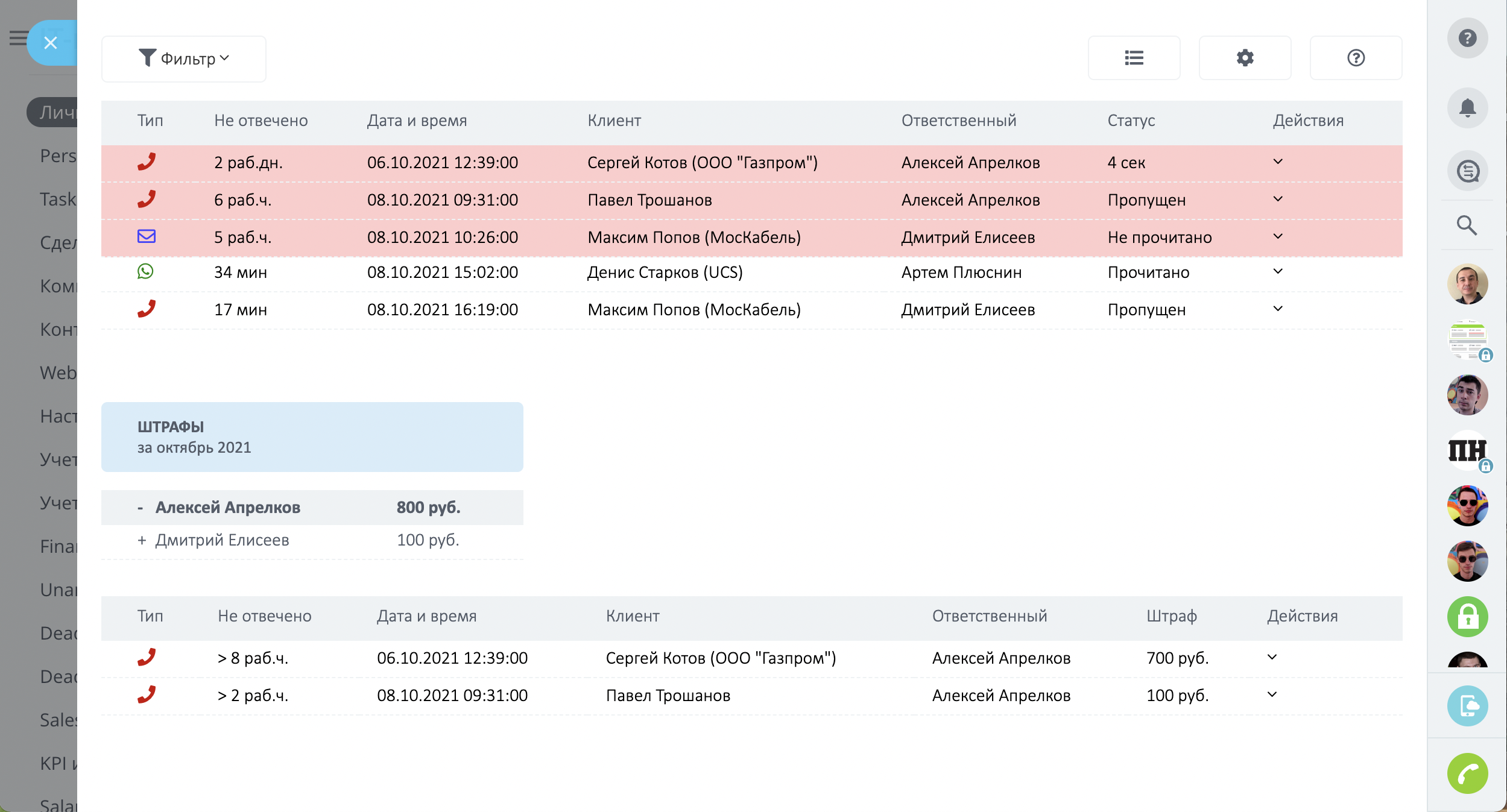 - Сотрудники тоже видят свои неотвеченные звонки и письма, видят штрафы за них. И это мотивирует их оперативно отвечать Клиентам.