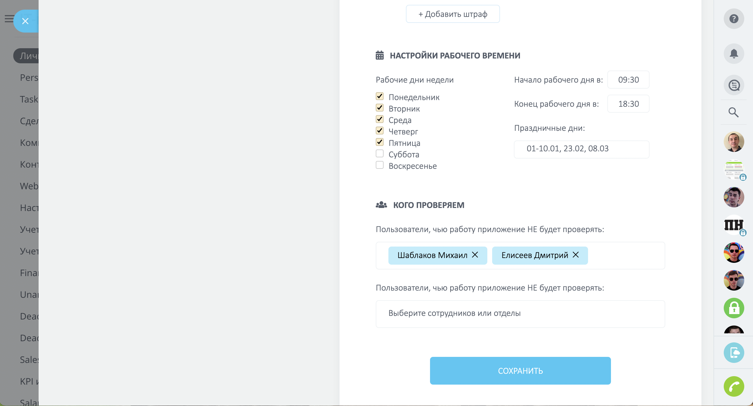 - Штраф и время ответа настраивается отдельно для звонков, писем и сообщений открытых линий.