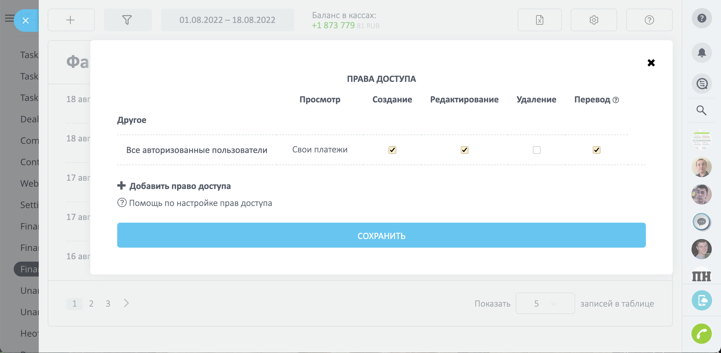 - Установить разным Сотрудникам и Отделам свои права на создание, редактирование, удаление и просмотр платежей;
