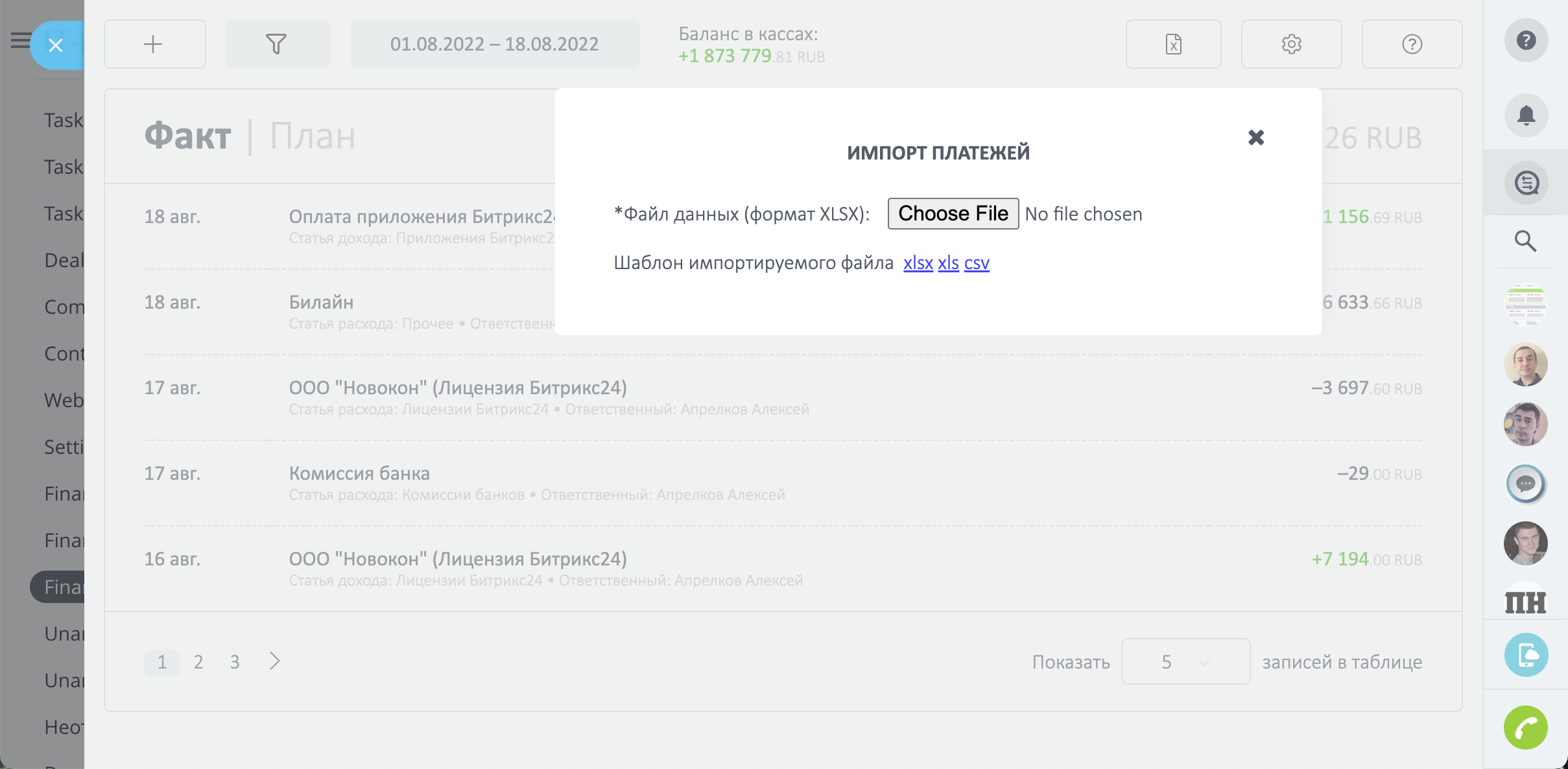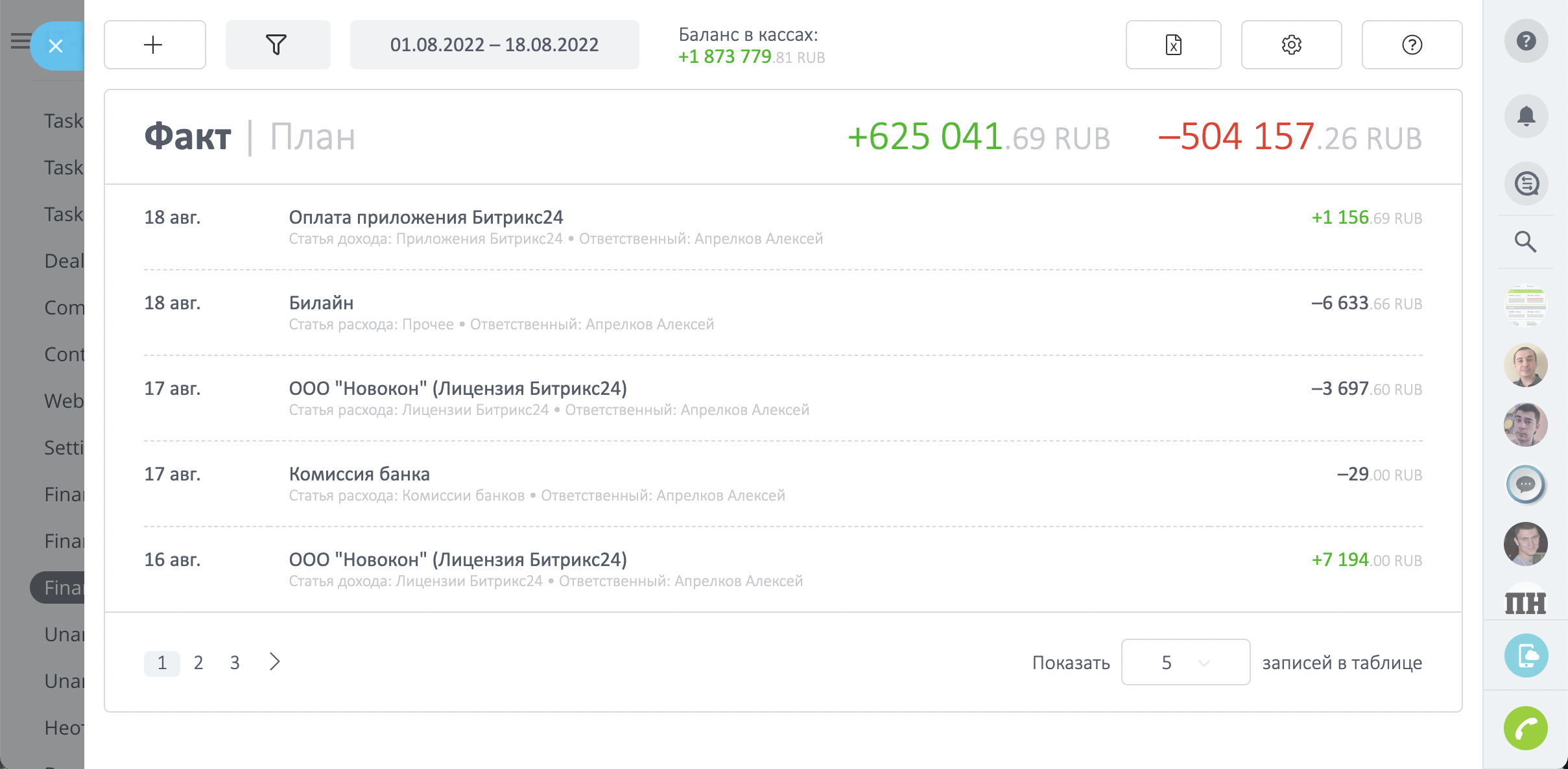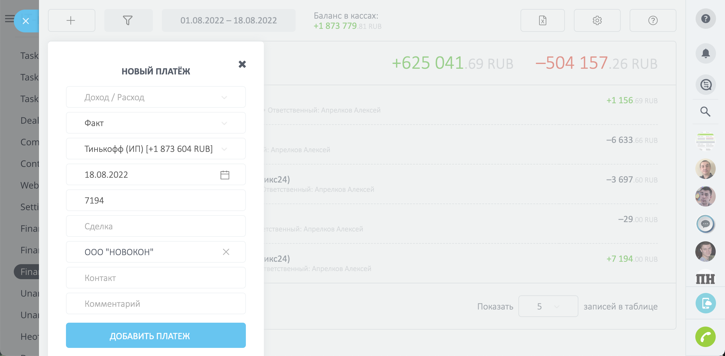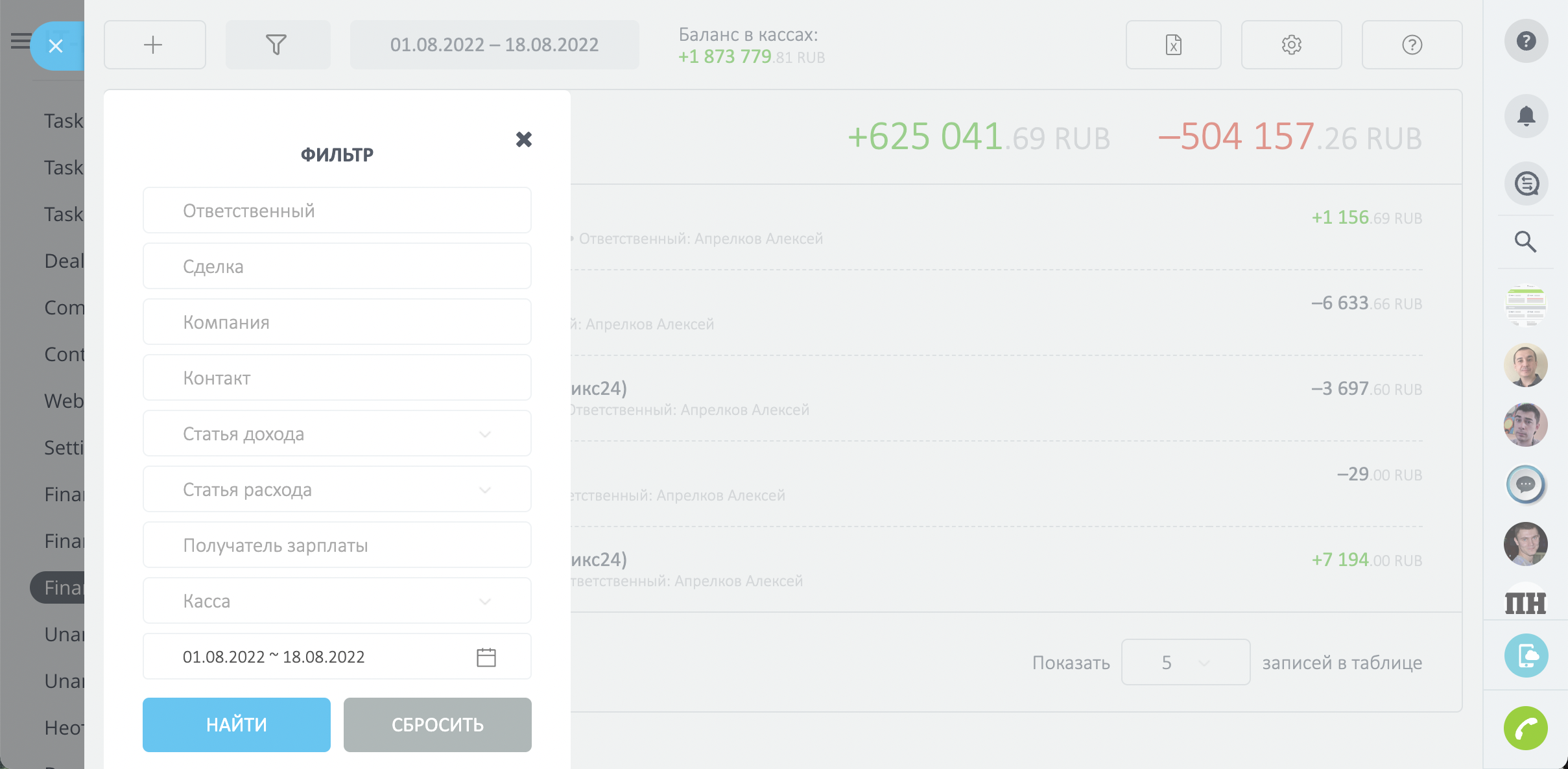 - Финансовые отчеты за определенный период, с возможностью фильтровать платежи по ответственным и сделкам.