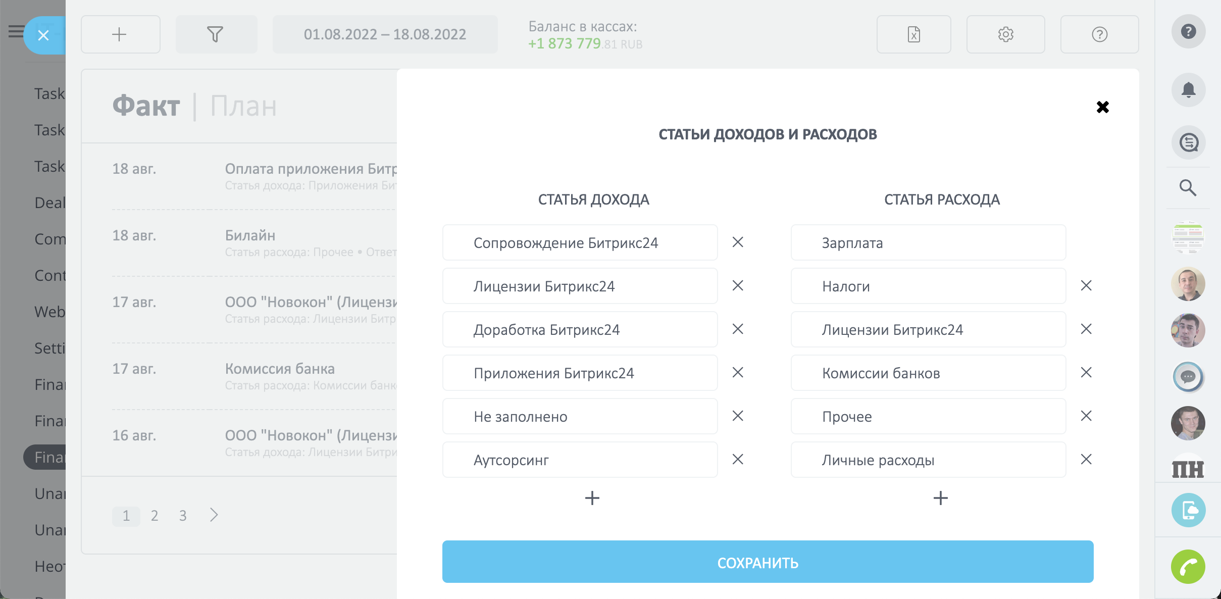 - Настраиваете статьи доходов, расходов и валюту;