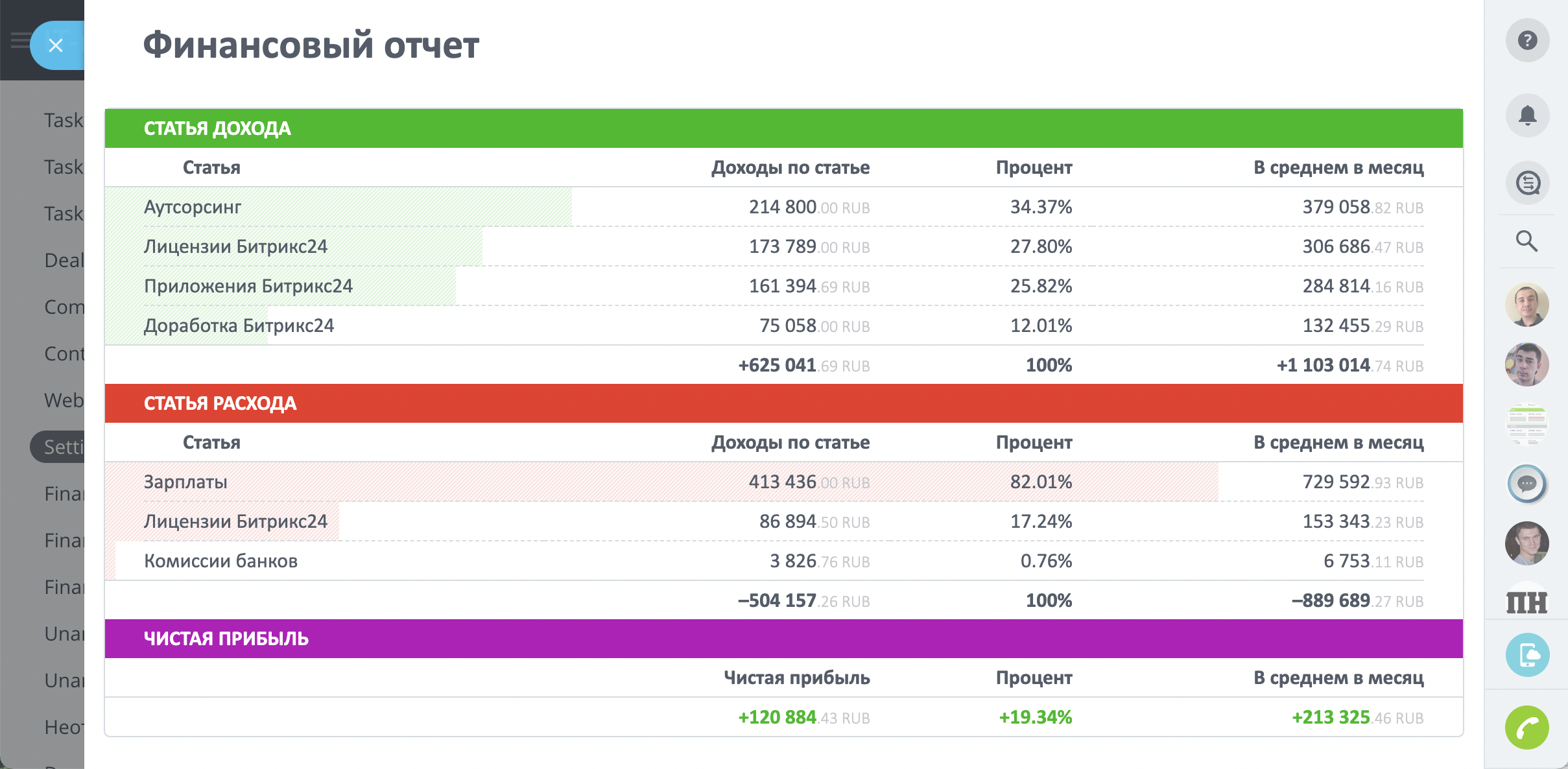 - прибыль по каждому специалисту, сделке, статьям доходов и датам;