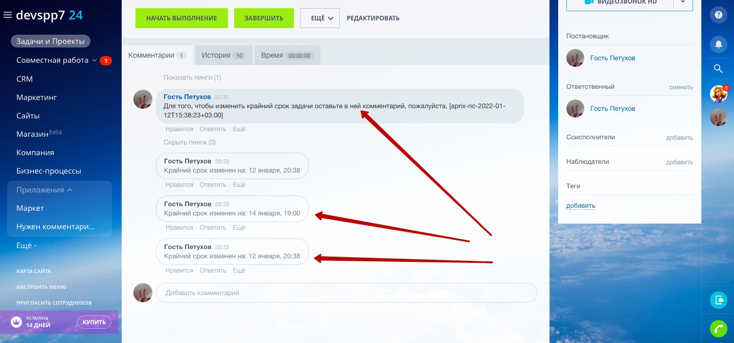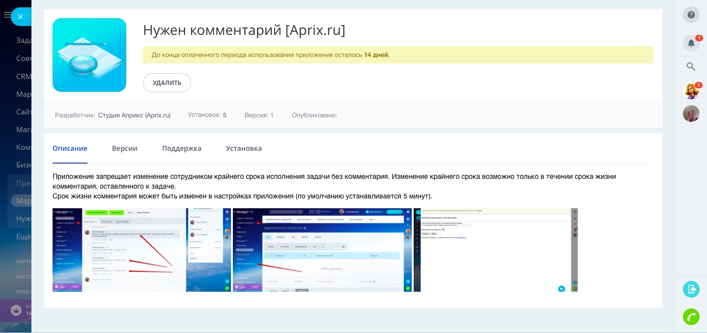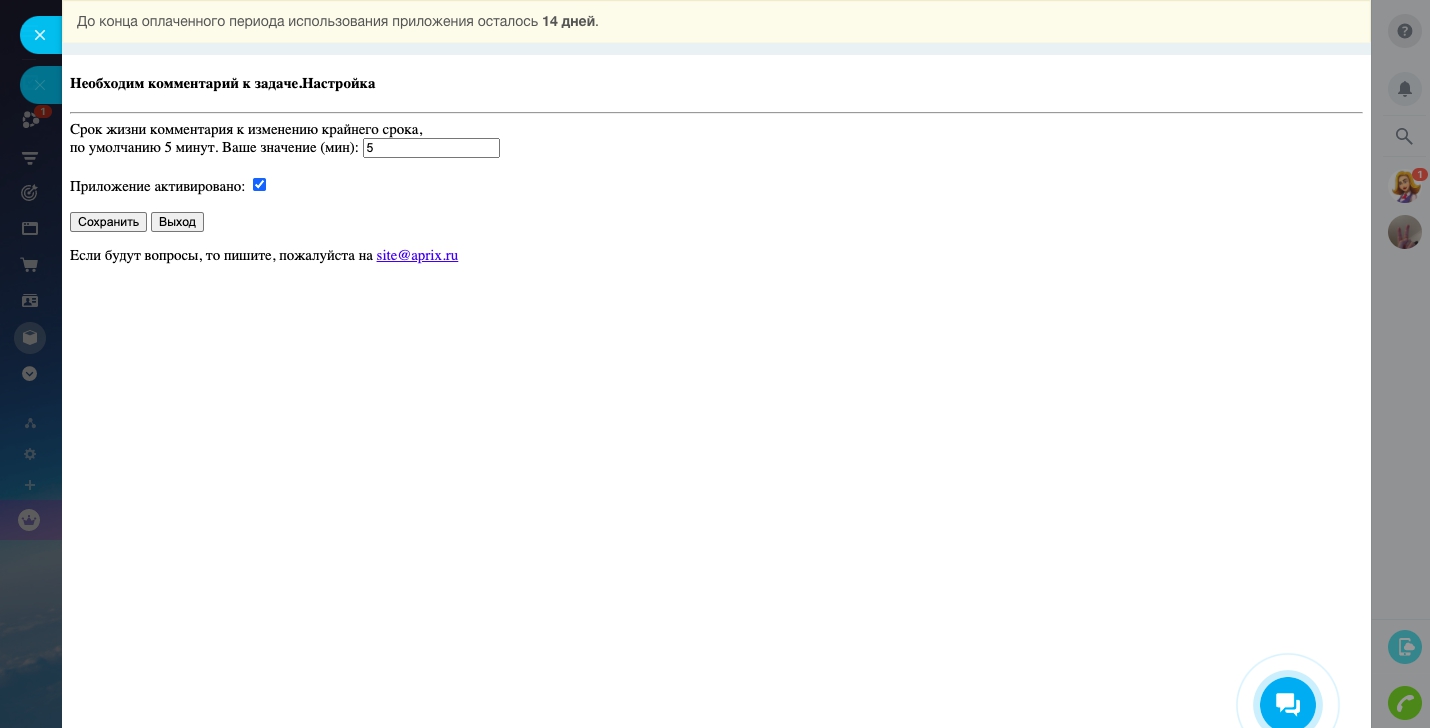 Приложение запрещает изменение сотрудником крайнего срока исполнения задачи без комментария в задаче. Изменение крайнего срока разрешено только в течении срока жизни комментария (указывается в настройках)