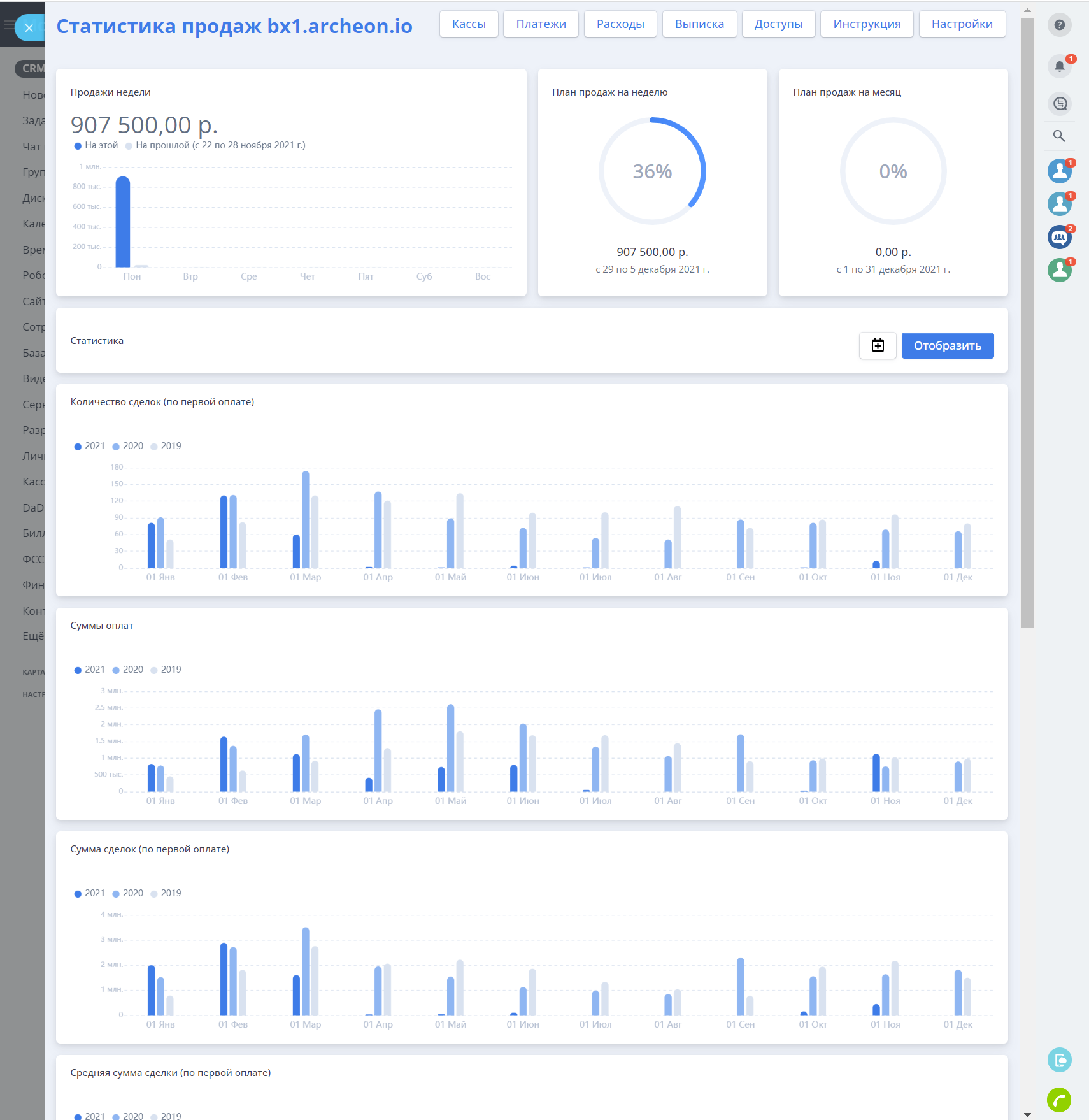 Сумма прихода, количество сделок, средняя сумма сделки, доходы и расходы в разрезе месяцев, недель или дней вы можете получать в режиме реального времени