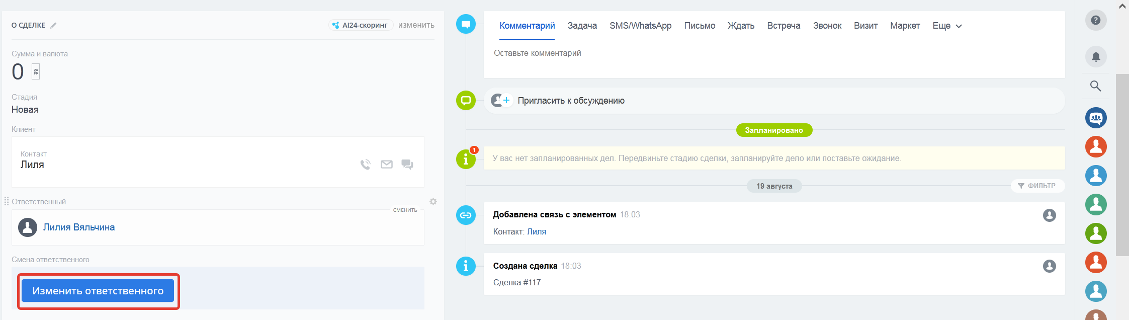 Историю изменений ответственных по сделке можно посмотреть во вкладке "История ответственных".
