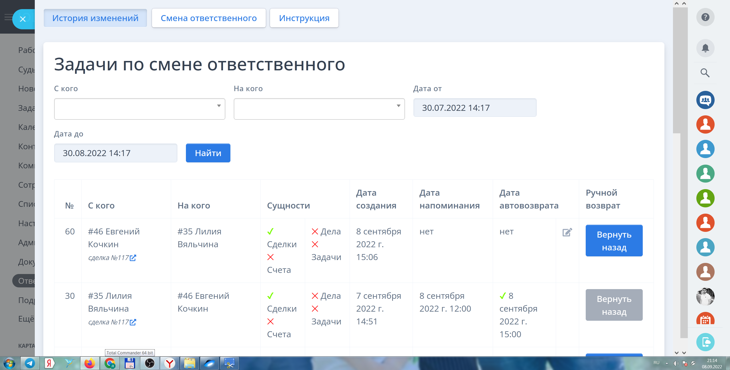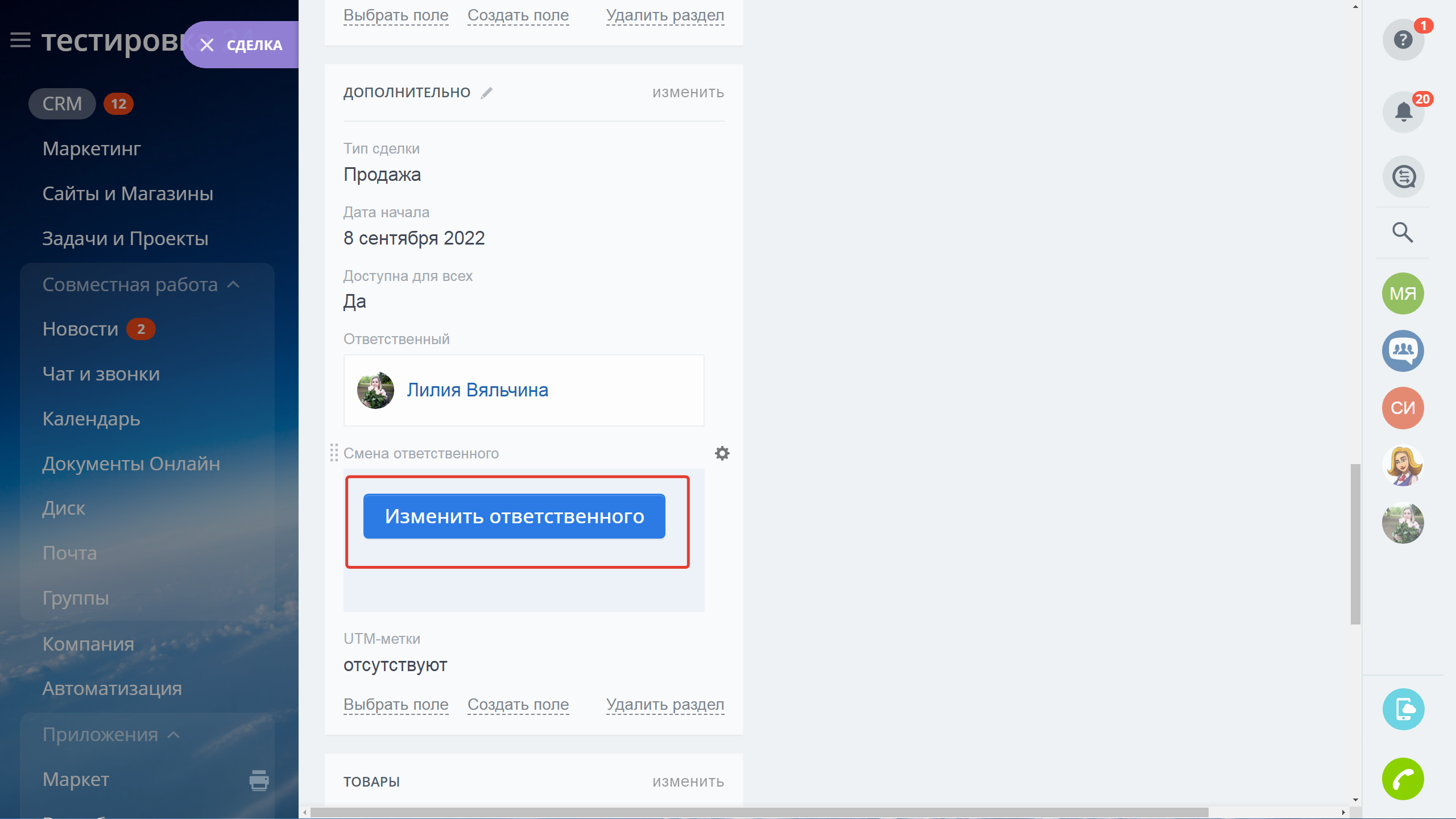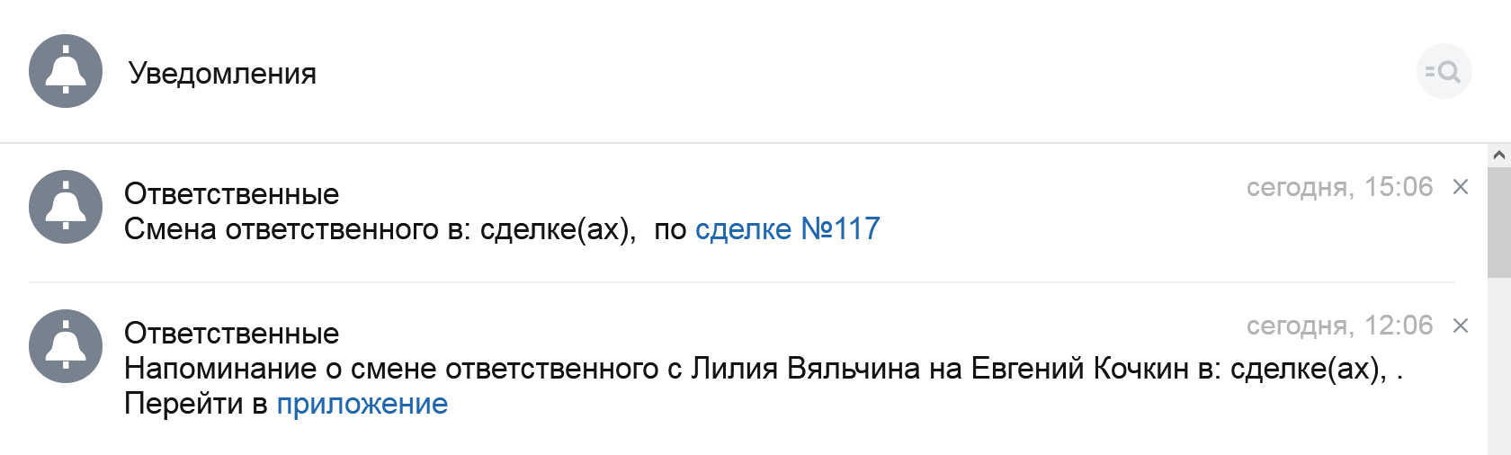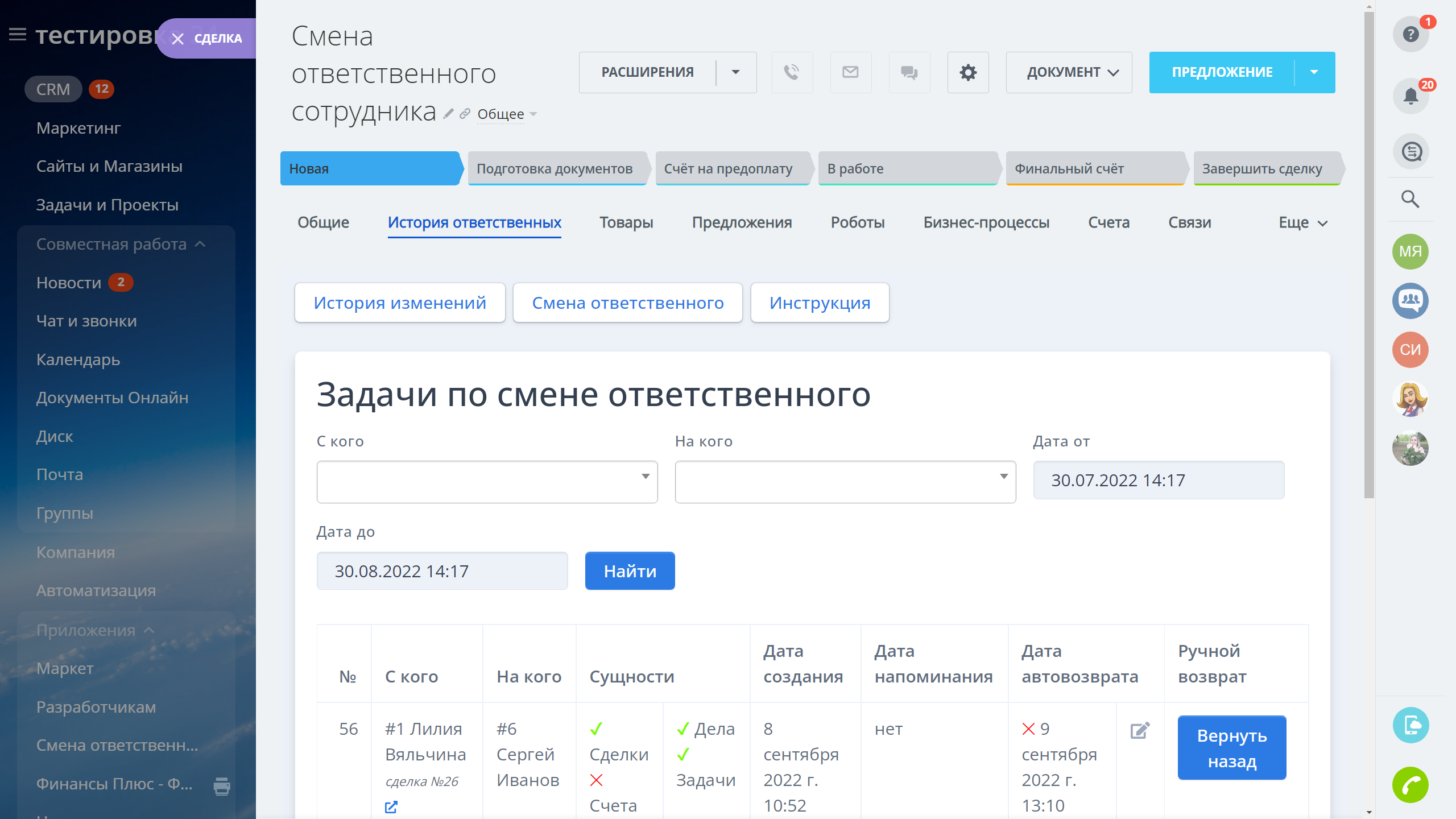 - Массовая смена ответственного в сделках, делах, задачах и счетах