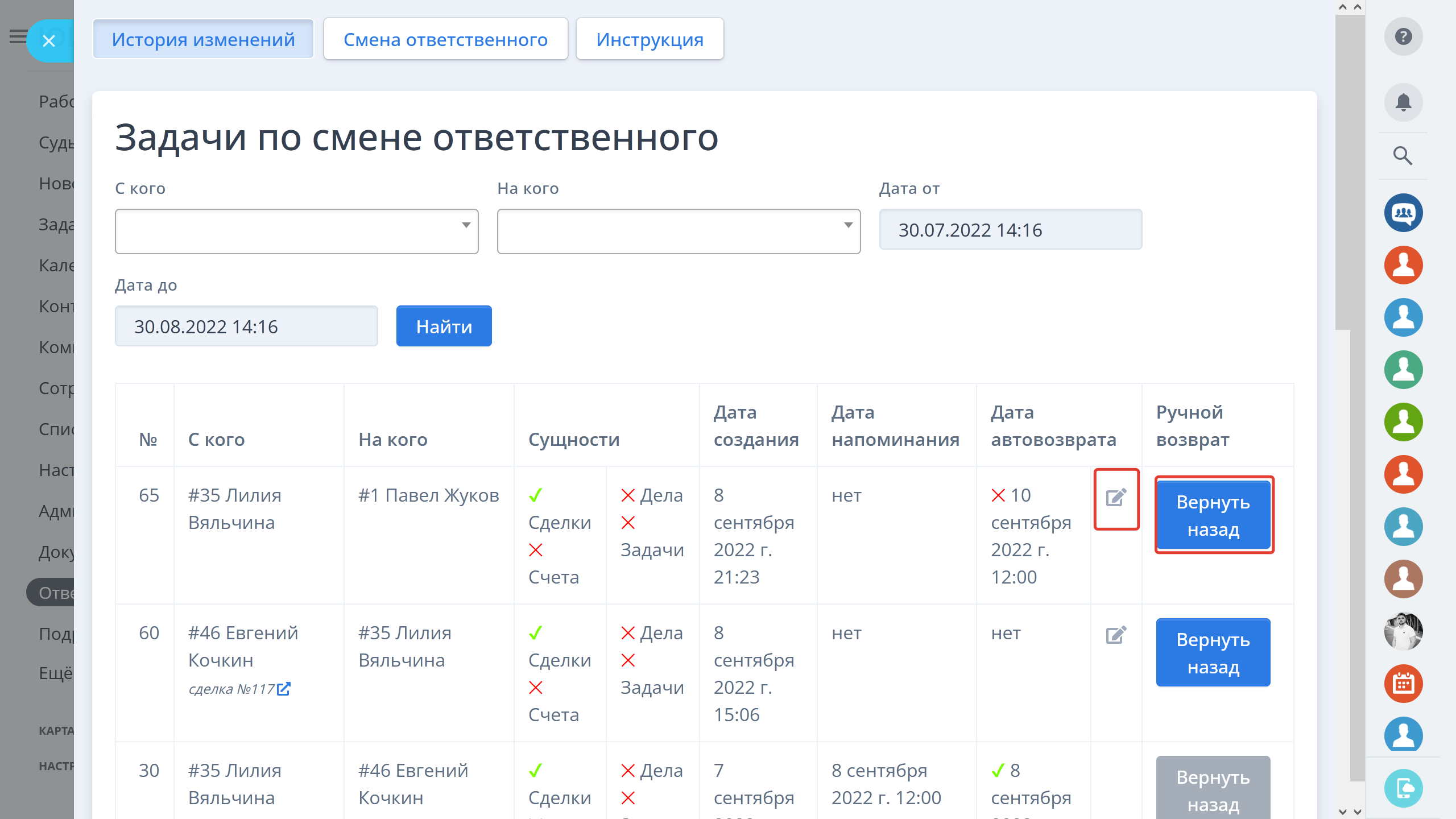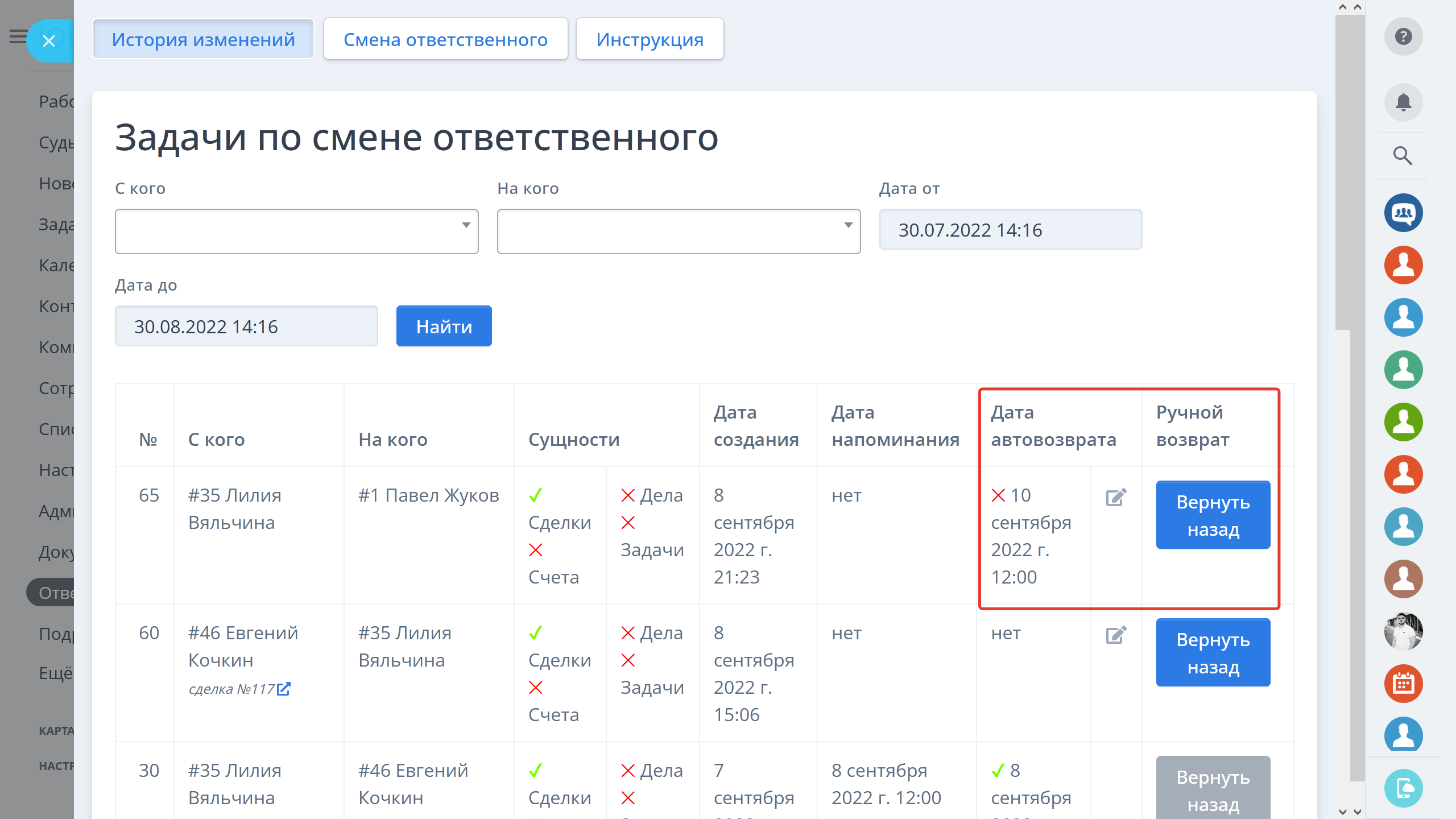 - Автоматический возврат ответственного по дате и времени
