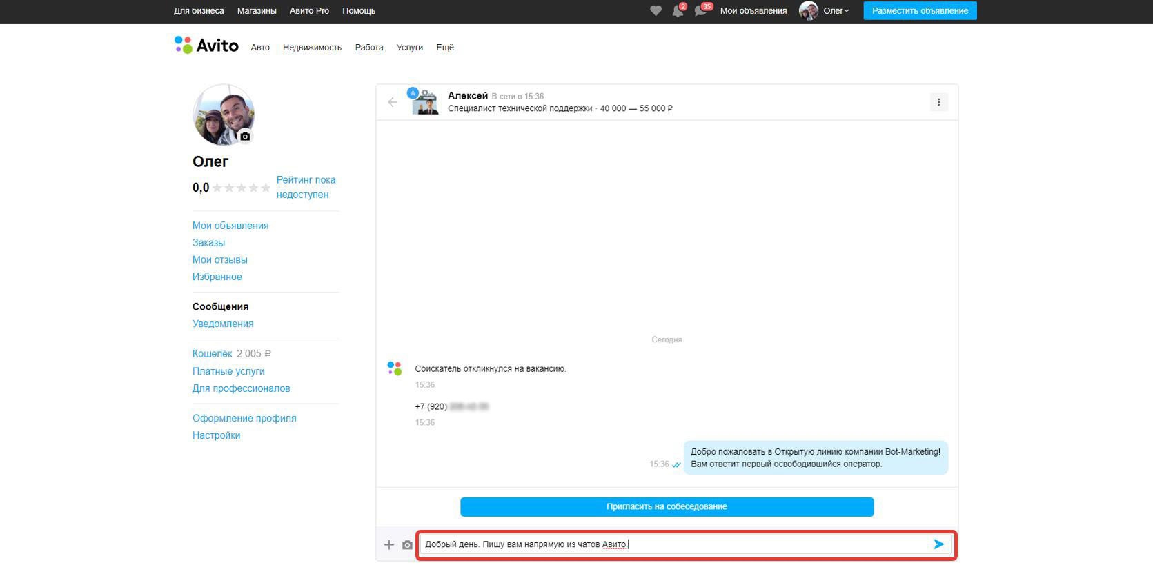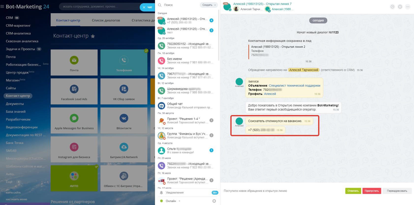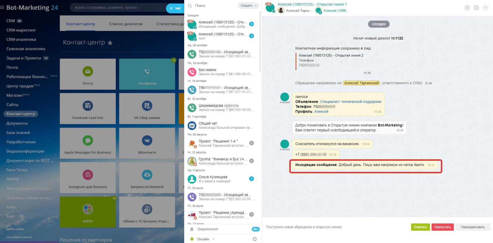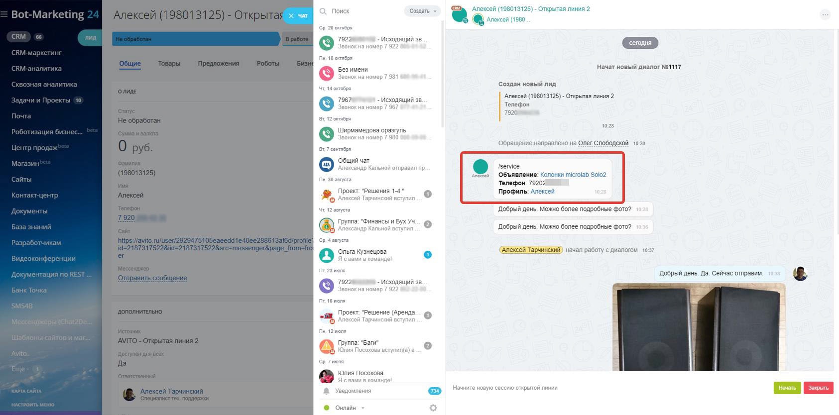- Возможность подтягивать данные города и номера телефонов из объявлений – легко маршрутизировать входящие обращения и назначать чат на нужного менеджера.
