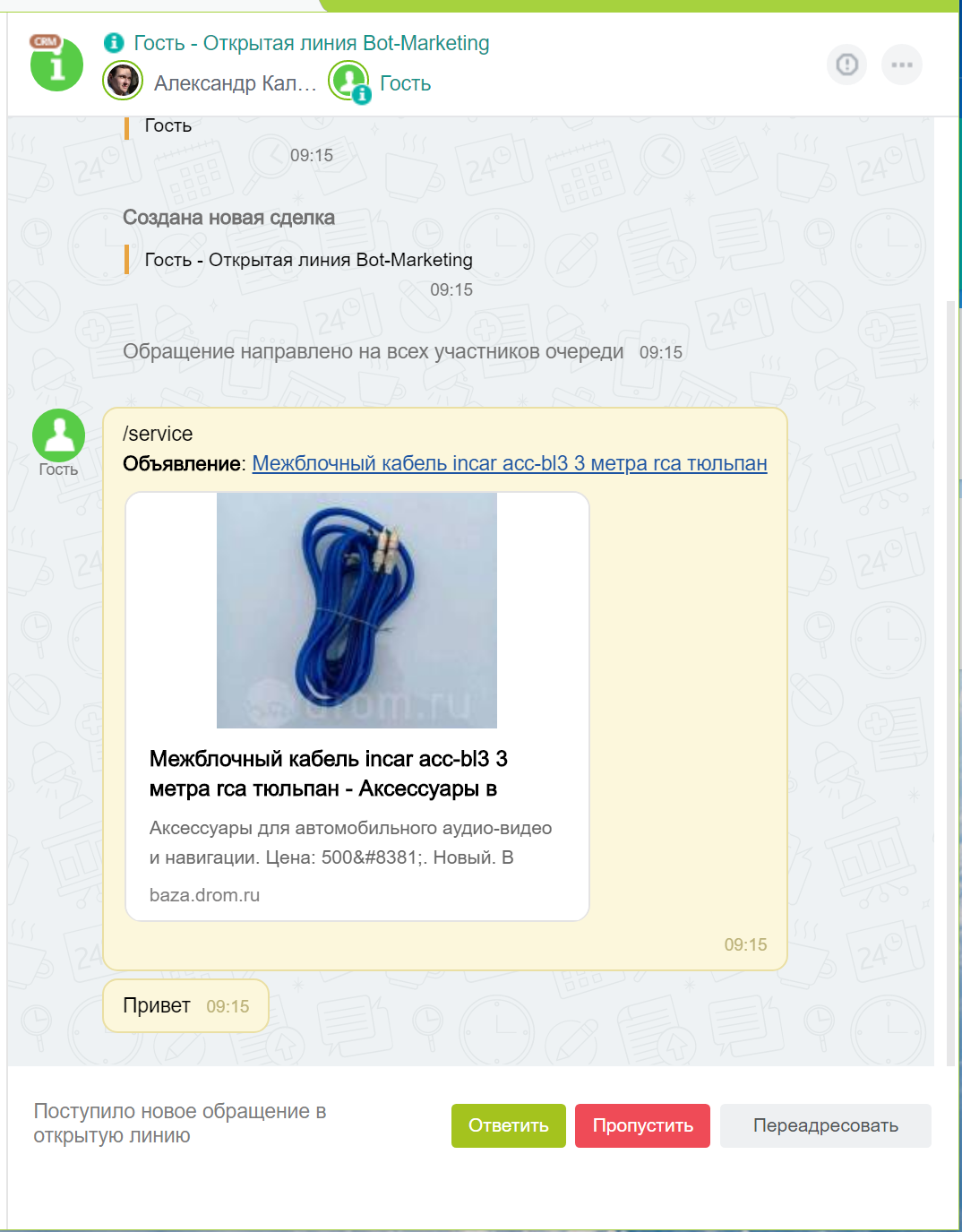 Приложение позволит Вам подключить чаты DROM в контакт-центре. Поддерживается обмен сообщениями и изображениями. Вы будете получать информацию о том, с какого объявления пишет клиент.