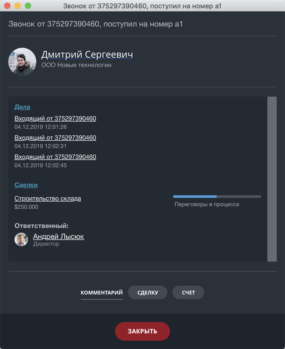 - Карточка звонка открывается автоматически – до поднятия трубки; если оператор не отвечает на вызов – карточка сворачивается;