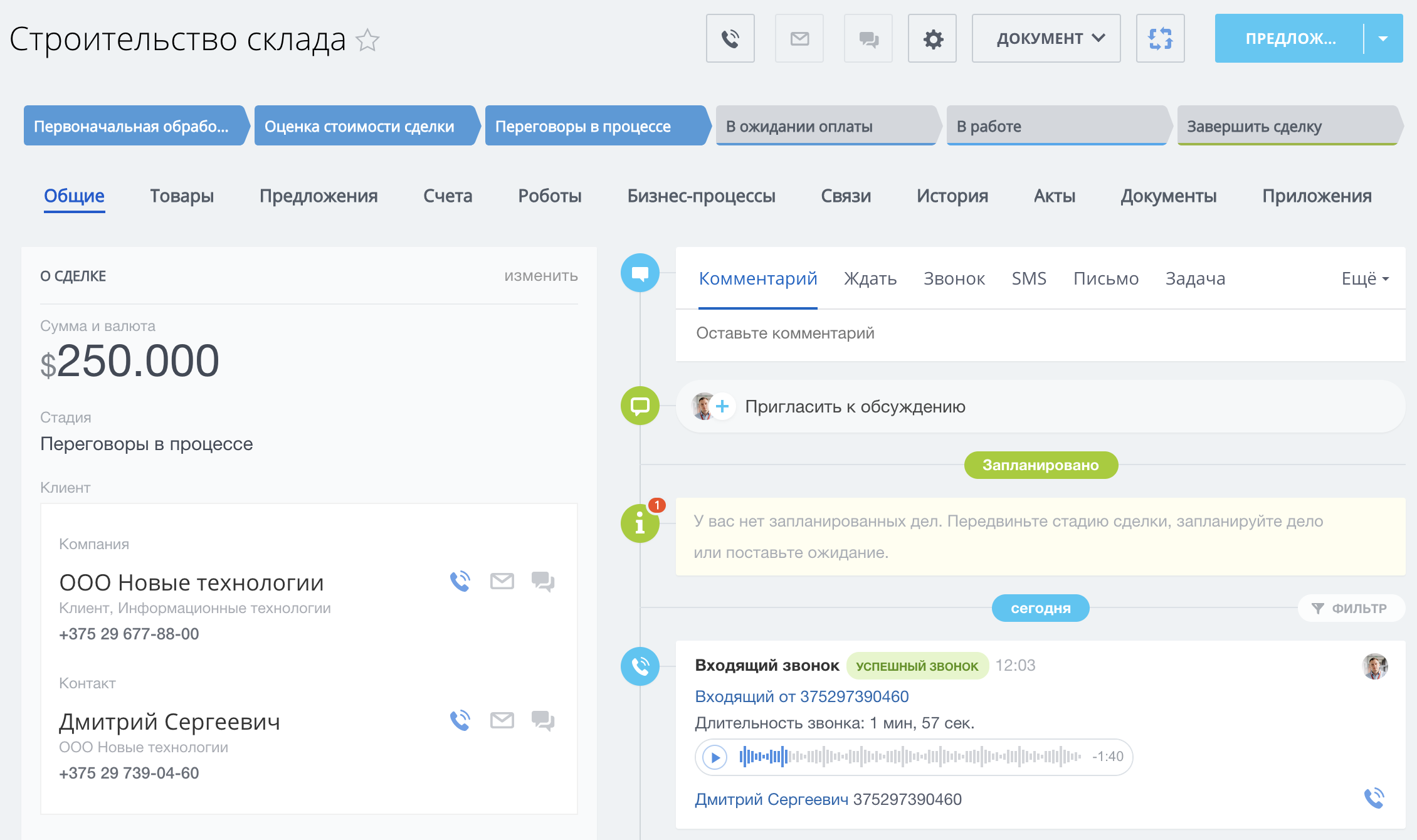 - После разговора для лида, контакта или компании создается событие с информацией о звонке (тип, длительность, имя оператора) и записью разговора, которую можно прослушать, не покидая страницу CRM;