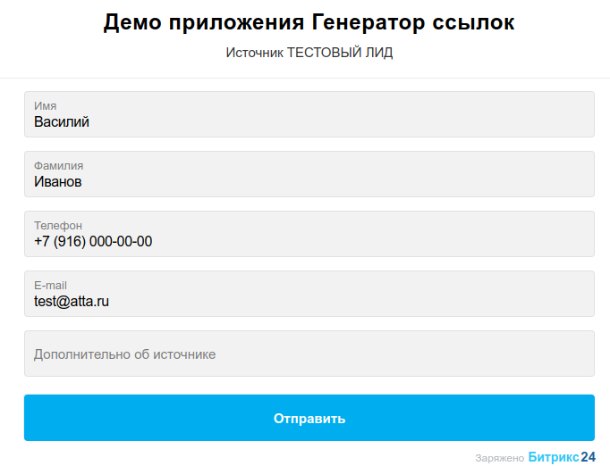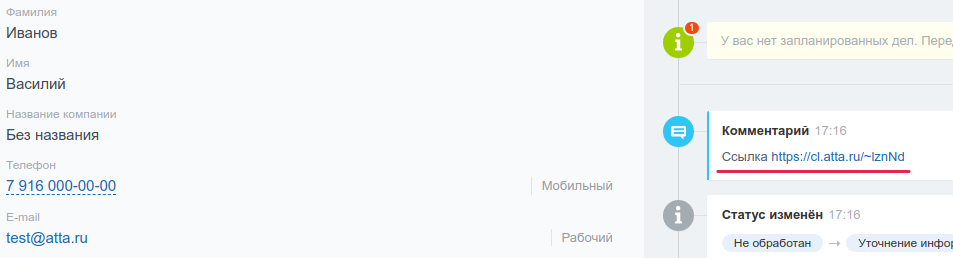 В скриншотах приведен пример генерации ссылки (https://cl.atta.ru/~lznNd) на CRM-форму с подстановкой значений некоторых полей. Полученная ссылка в примере записана в ленту комментариев лида.