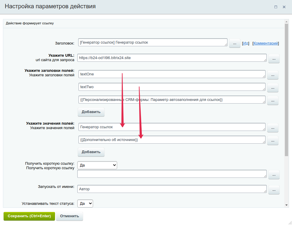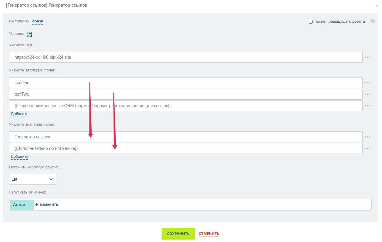 Если нужно указать "{{Персонализированные CRM-формы: Параметр автозаполнения для ссылок}}" для уникальной ссылки на CRM-форму, то указывайте этот параметр в поле "Укажите заголовки полей" последним! Без заполнения поля значения для него.