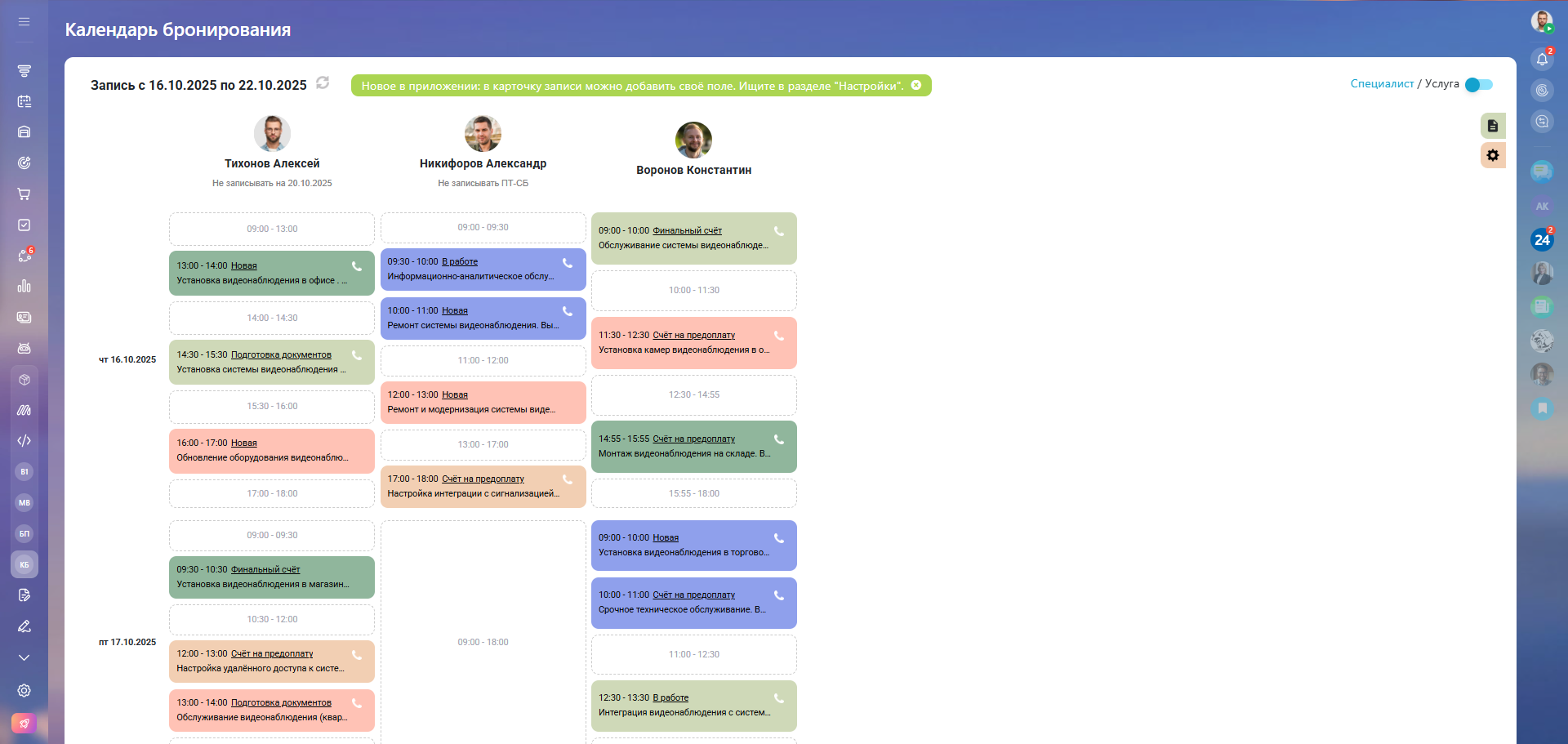 Приведём пример бизнеса с записью, когда нужно планировать не только в разрезе ресурсов, но и людей (персонала) одновременно.
