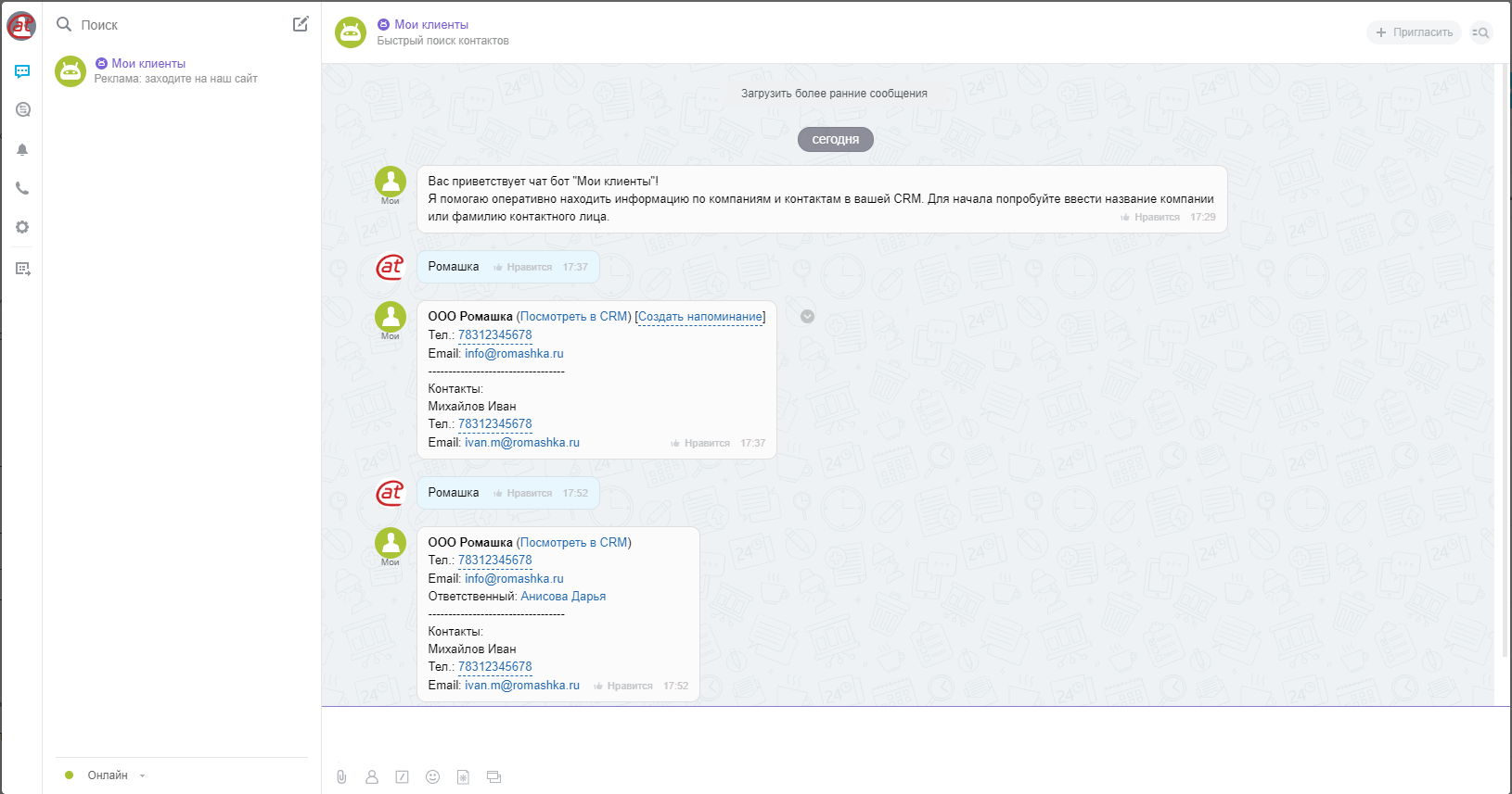 Установите чат-бот Мои клиенты и находите быстро любую компанию или контакт простым сообщением в чат. Чат-бот найдёт нужную сущность CRM на вашем портале и предоставит компактную справку.