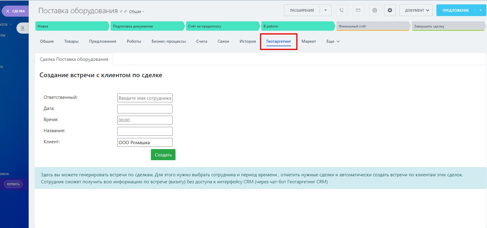 На вкладке Геотаргетинг в карточке вы можете генерировать встречи с клиентами. Для этого нужно выбрать сотрудника и период времени, затем автоматически создать встречу. Сотрудник сможет получить всю информацию по встрече (визиту) без доступа к интерфейсу CRM (через чат-бот Геотаргетинг CRM).