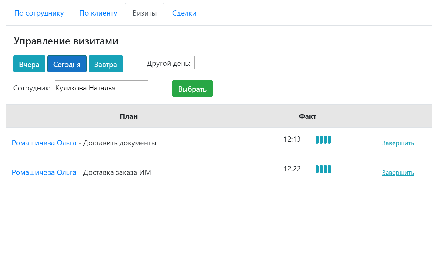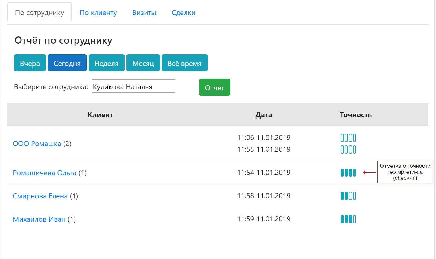 В отчёте вы увидите, какие планы по визитам были у данного сотрудника, были ли они выполнены (отмечены через геолокацию)