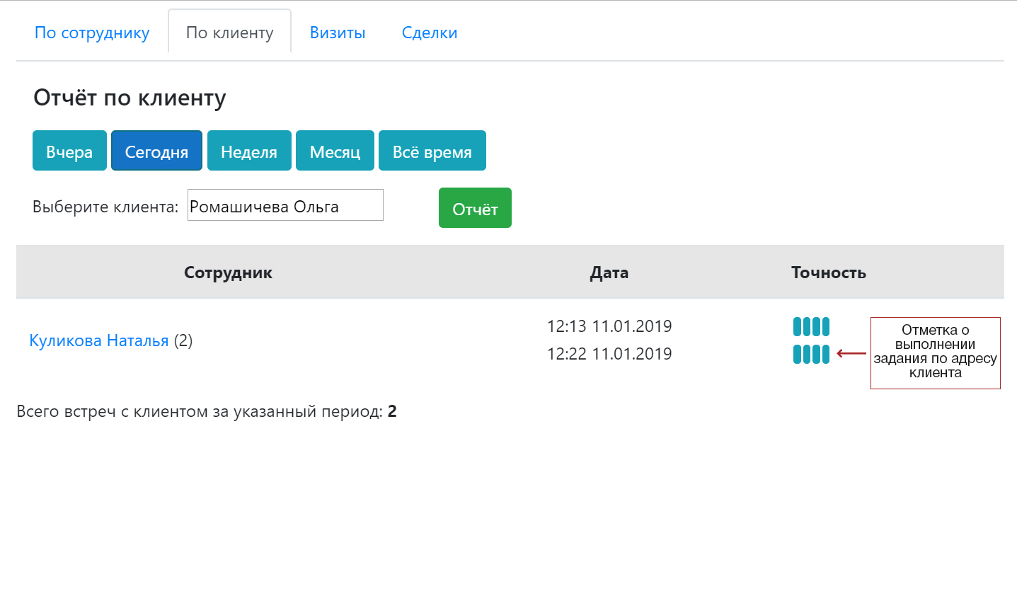 Когда это нужно: пользователь хочет получить информацию, какие сотрудники и когда посещали того или иного клиента.