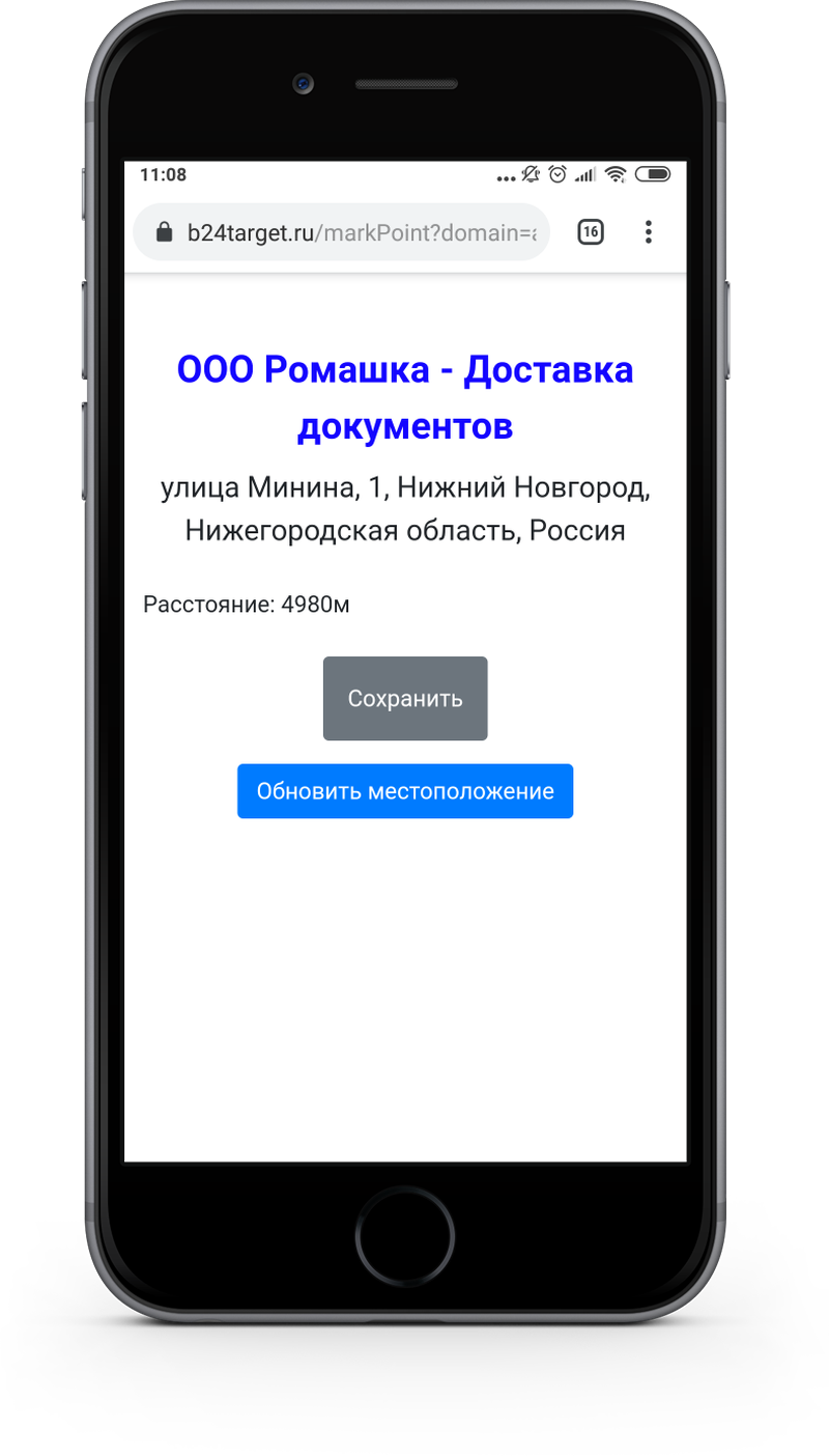 Вы просто запрашиваете по части названия компании (или по фамилии контакта) у чат-бота, и если такая сущность обнаружена в вашей CRM, то через быструю ссылку вы переходите во внешний браузер вашего мобильного устройства для выполнения функции отметки по адресу клиента. На странице браузера не нужно выполнять никаких действий, кроме инициации повторного запроса координат GPS.