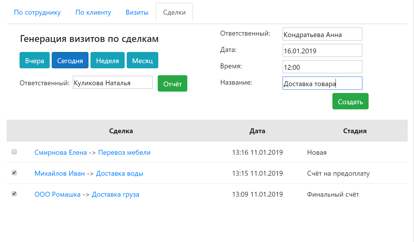 В этом отчёте вы сможете по избранным сделкам сгенерировать встречи (визиты) для ваших курьеров (или экспедиторов).