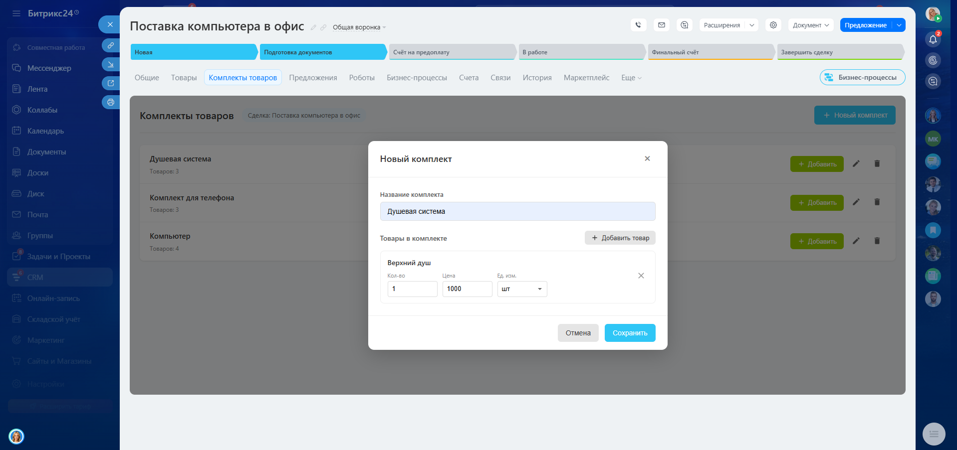 Теперь менеджер может выбрать нужный комплект товаров и сразу добавить его в сделку.