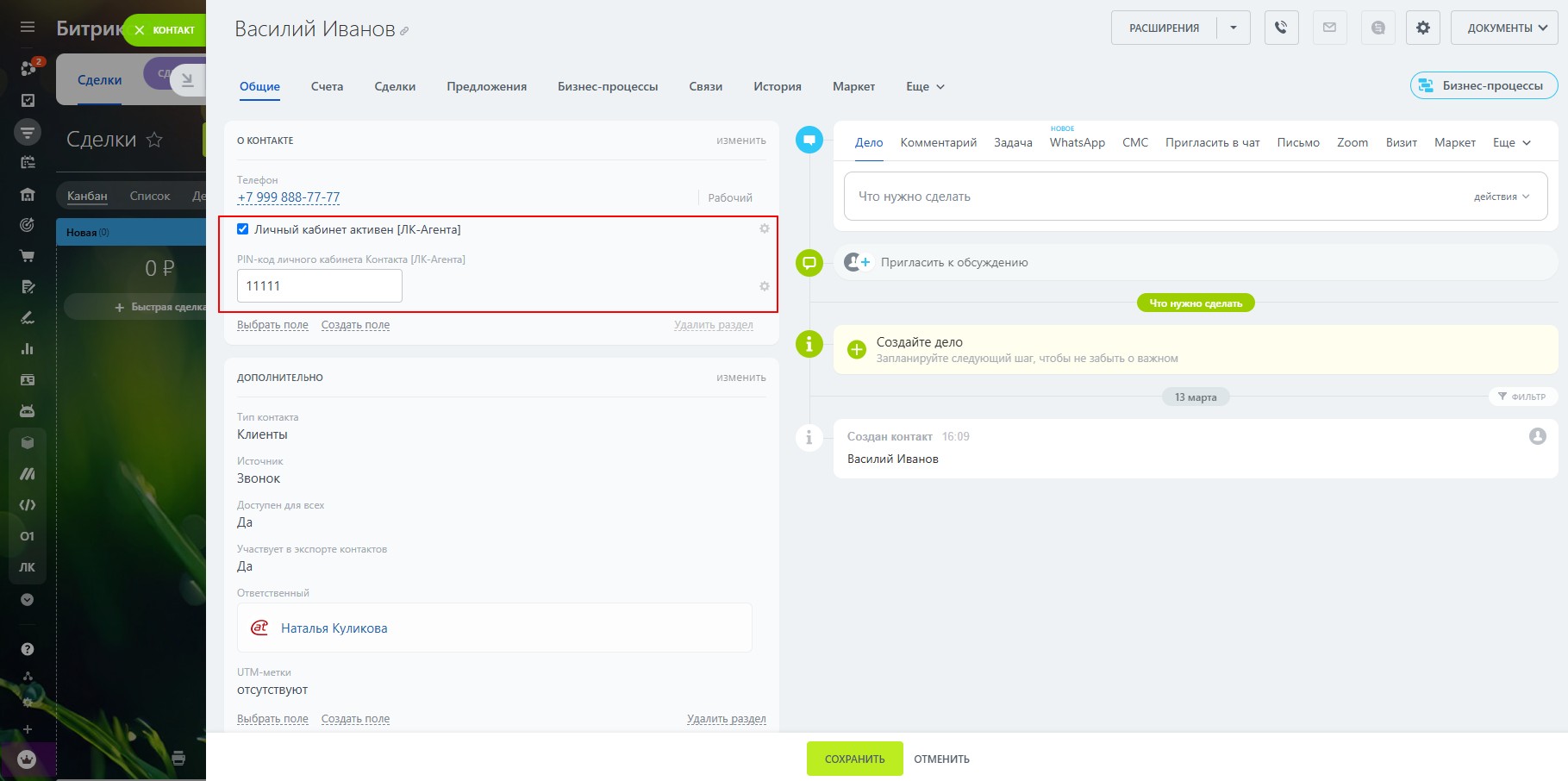 Для того, чтобы агент получил доступ к в личный кабинет в карточке установим значение Личный кабинет активен = Да и укажем ПИН-код для входа.