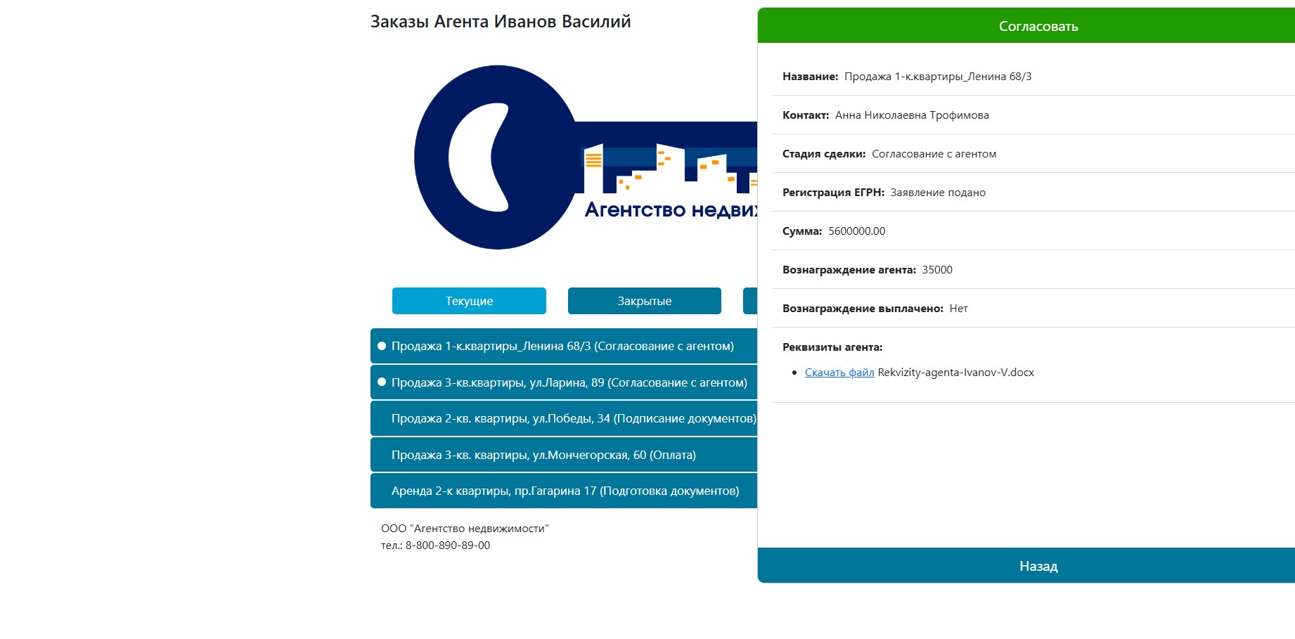 Агент может зайти в личный кабинет, ознакомиться с данными сделки, даже скачать договор или любой другой файл, например, реквизиты карты. Если все данные указаны верно, то он просто нажимает кнопку Согласовать.