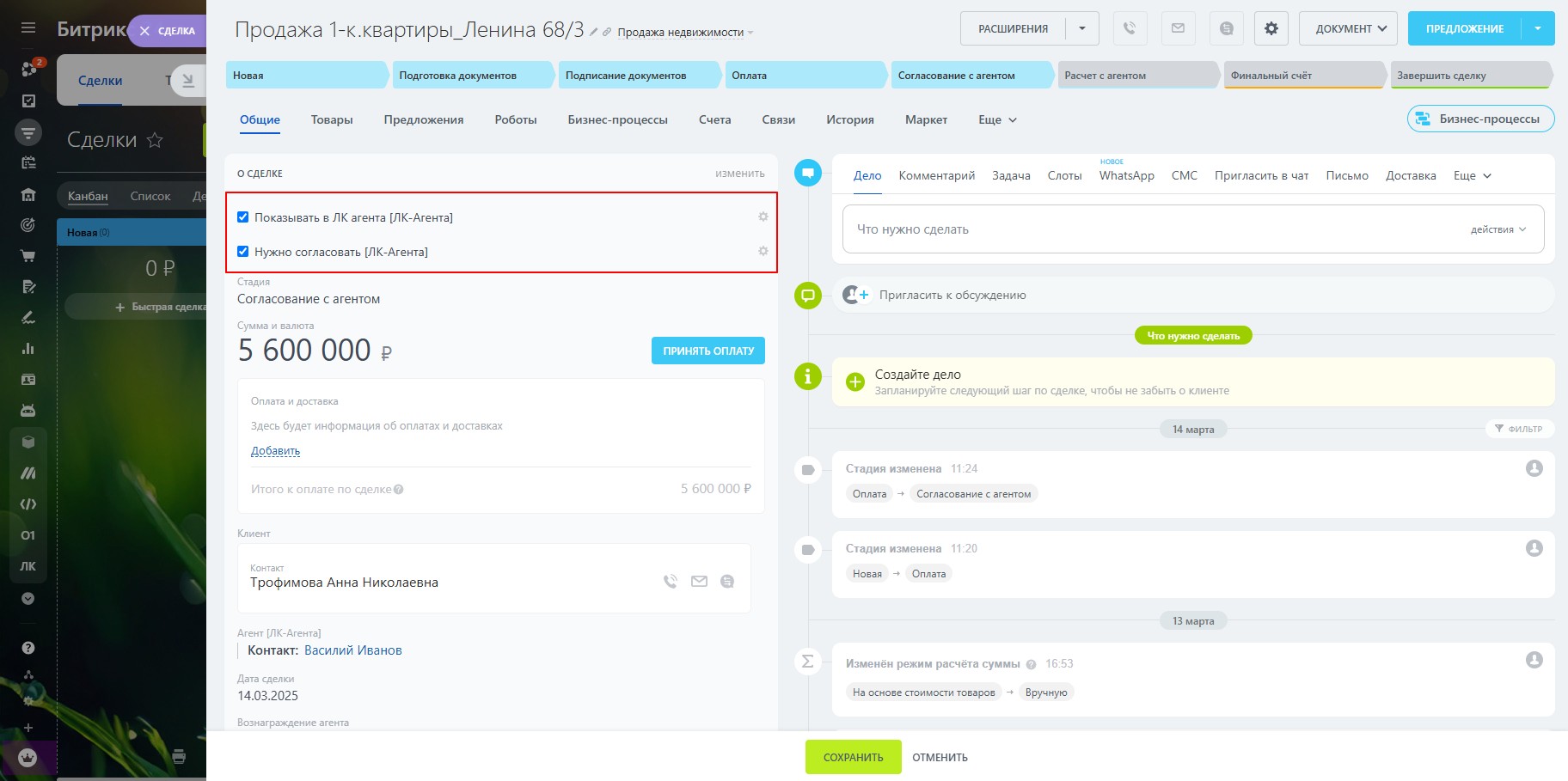 Важно: после нажатия на кнопку Согласовать, сделка изменит стадию на следующую. Обратите внимание, агент может не согласовать заказ и для этого не предусмотрена какая-то специальная кнопка. Вам следует настроить робота, который отследит время нахождения на стадии согласования и отправит уведомление менеджеру.