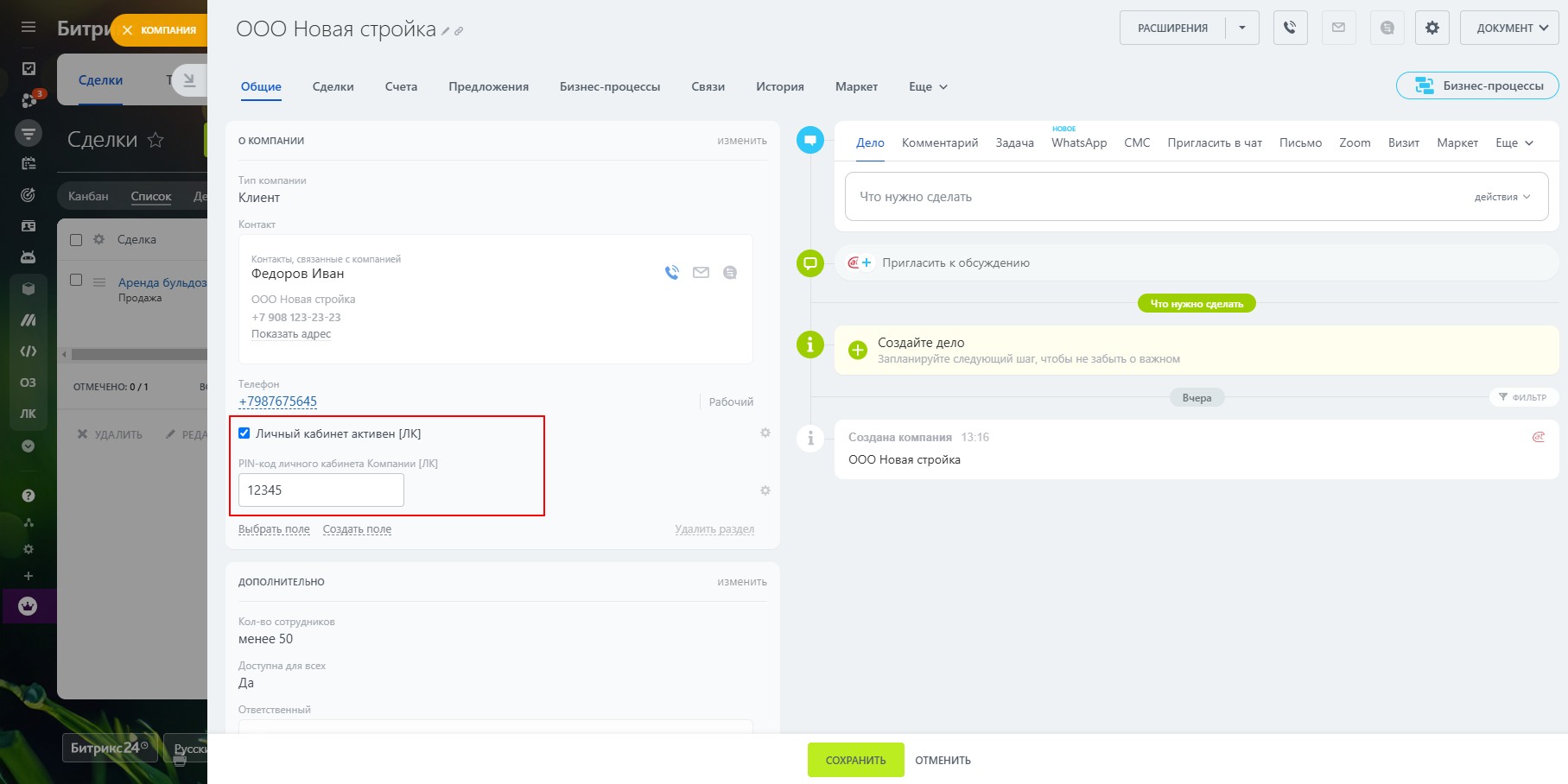 Для того, чтобы клиент ООО "Новая стройка" получил доступ к в личный кабинет, в карточке установим значение Личный кабинет активен = Да и укажем 5-значный ПИН-код для входа.