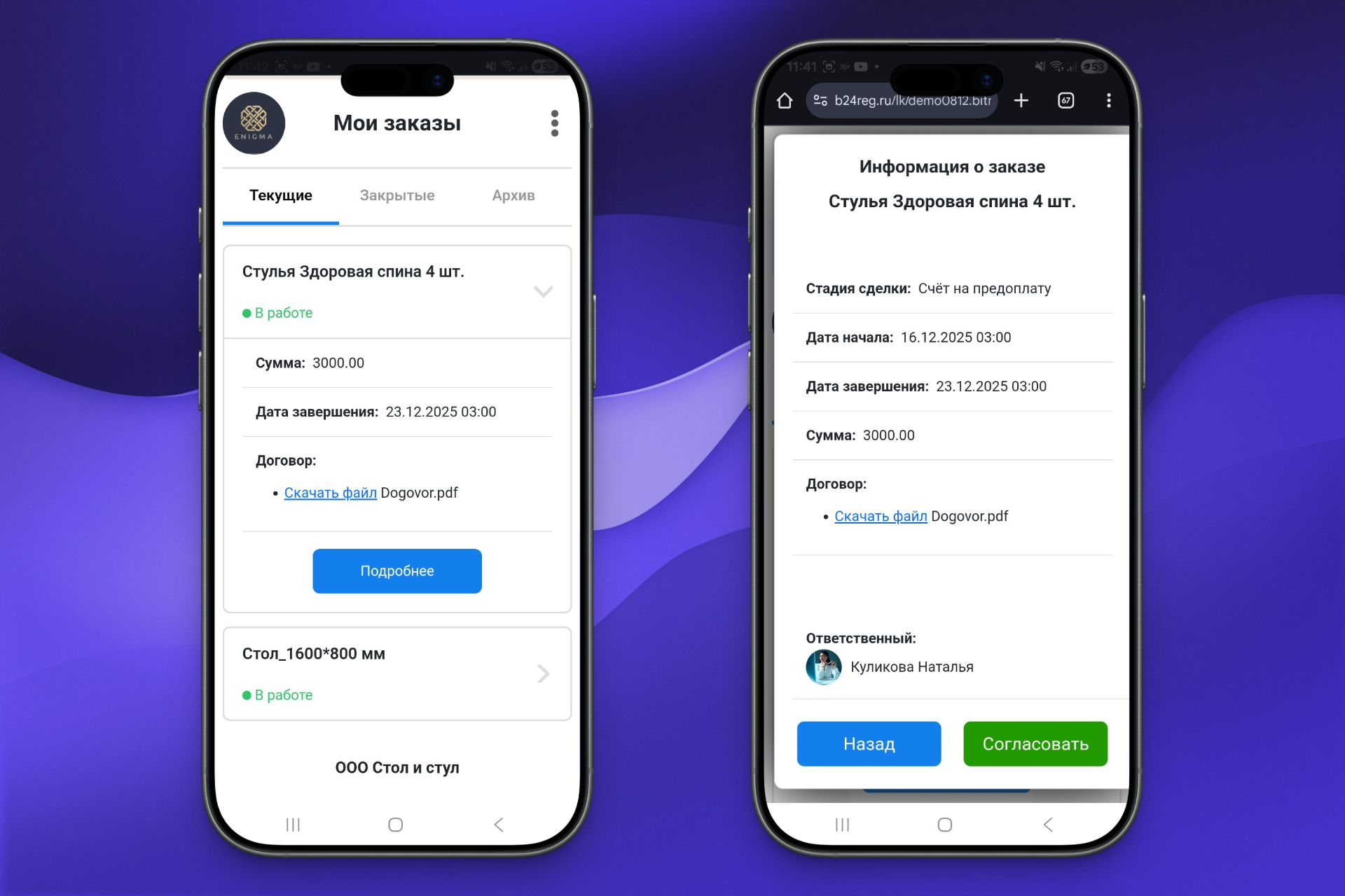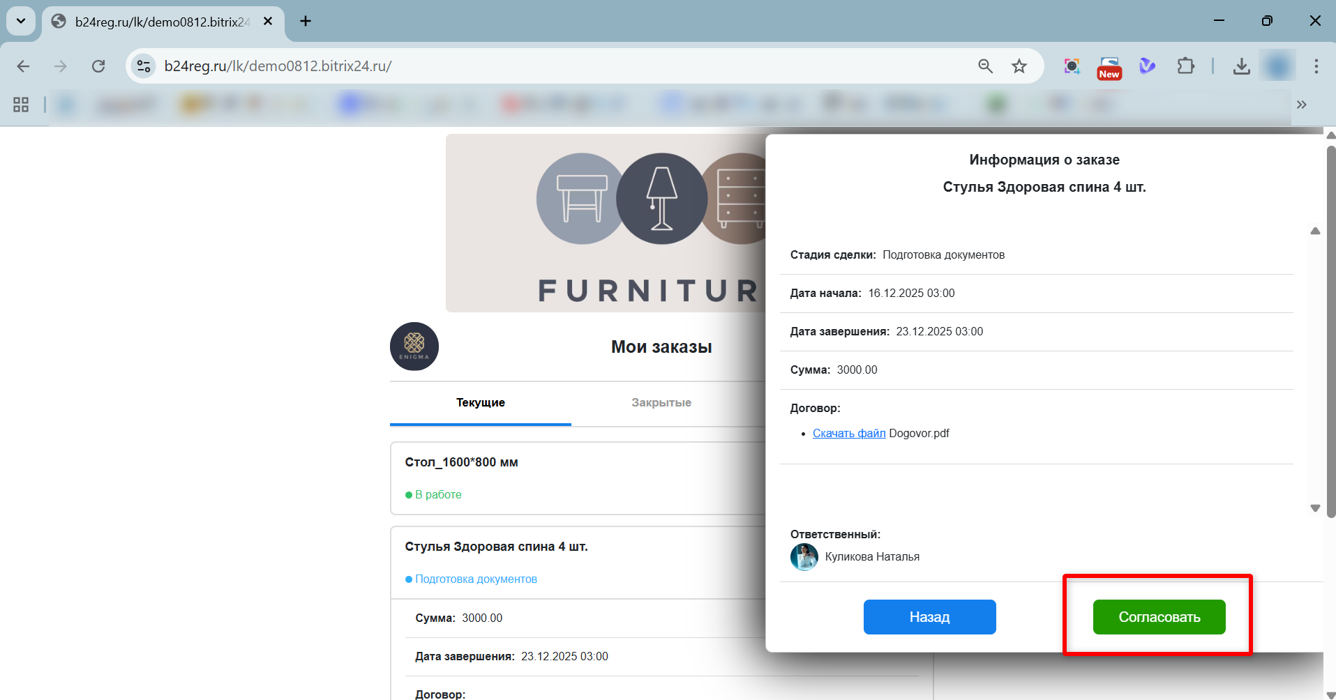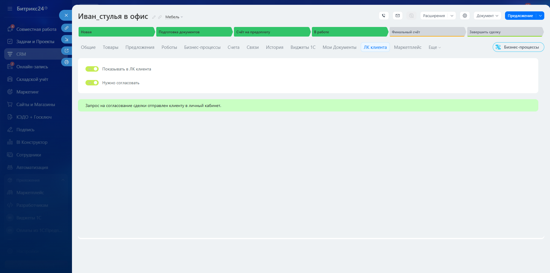 Важно: после нажатия на кнопку Согласовать, сделка изменит стадию на следующую. Обратите внимание, клиент может не согласовать заказ и для этого не предусмотрена какая-то специальная кнопка. Вам следует настроить робота, который отследит время нахождения на стадии согласования и отправит уведомление менеджеру.