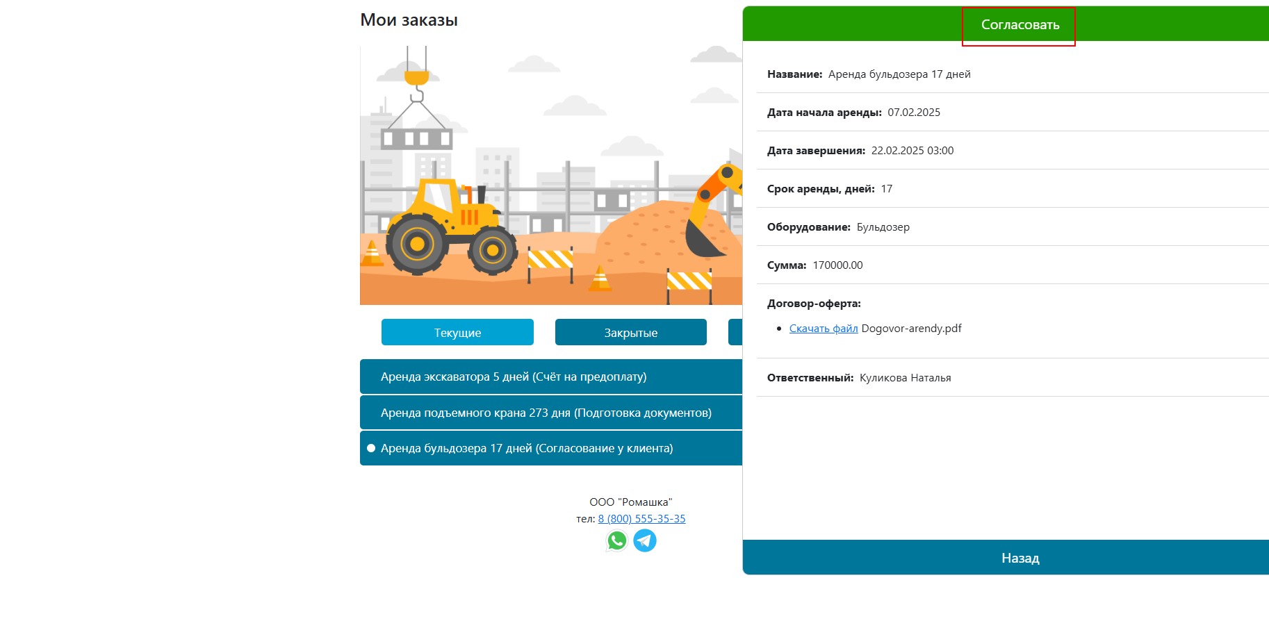 Клиент в свою очередь может зайти в личный кабинет, ознакомиться с данными заказа, даже скачать договор. Если клиента устраивает указанная дата, то он просто нажимает кнопку Согласовать.