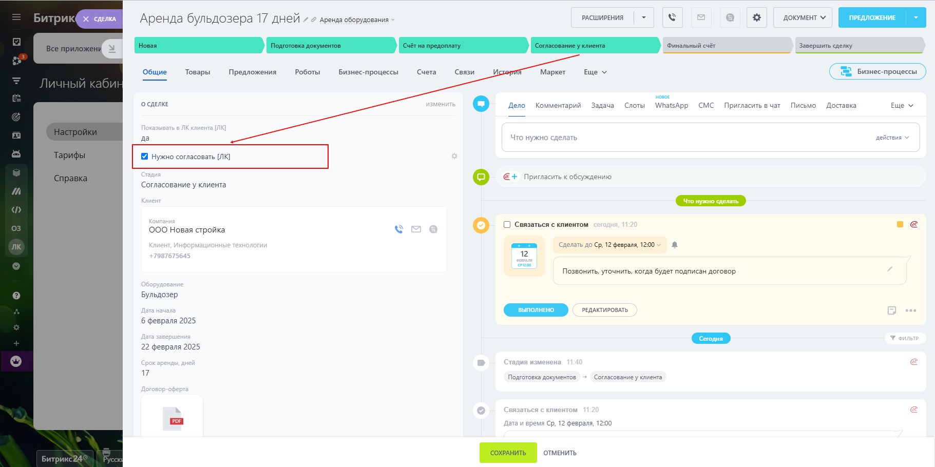 Стандартный тариф позволяет использовать режим согласования сделки с клиентом. В этом режиме клиент может нажать кнопку Согласовать и соответствующая сделка сменит этап на следующий.
