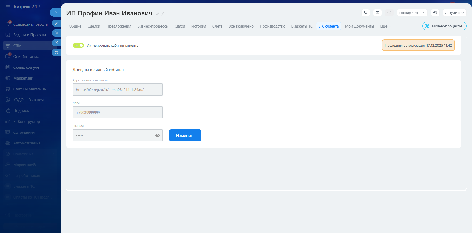 Для того, чтобы клиент получил доступ в личный кабинет, в карточке перейдите на вкладку ЛК клиента и активируйте кабинет клиента. Задайте 5-значный ПИН-код для входа. Отключить доступ можно в любое время, используя простой переключатель.