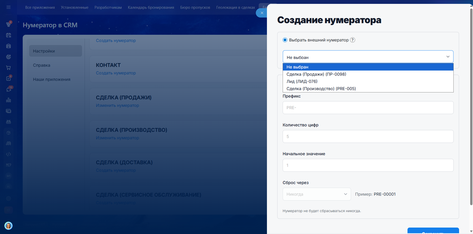 - Внешний нумератор - позволяет использовать нумератор другой сущности или воронки. Выбор осуществляется из выпадающего списка доступных нумераторов.