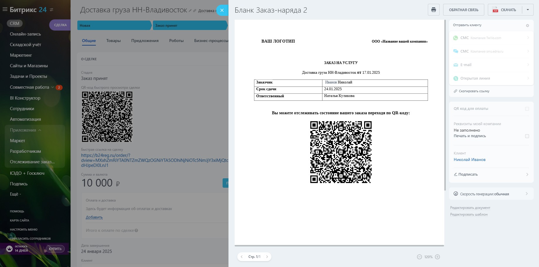 После перевода в данную стадию, переходим в раздел Документы и генерируем бланк заказ-наряда: