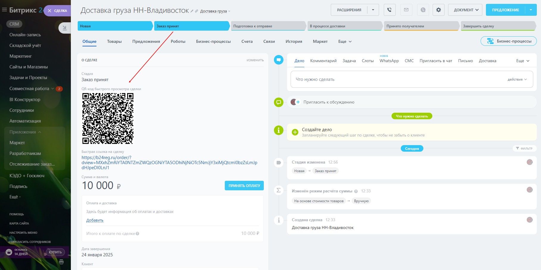 Если вы переключите приложение в режим открытия сделки, то после сканирования QR будет открываться ваш Битрикс24 с данной сделкой (требуется авторизация).
