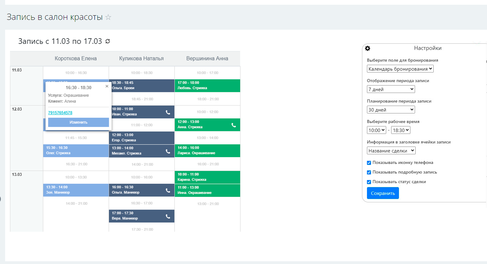 Внешний вид в формате «шахматки» наглядно показывает занятость мастеров в вашем салоне согласно записи.