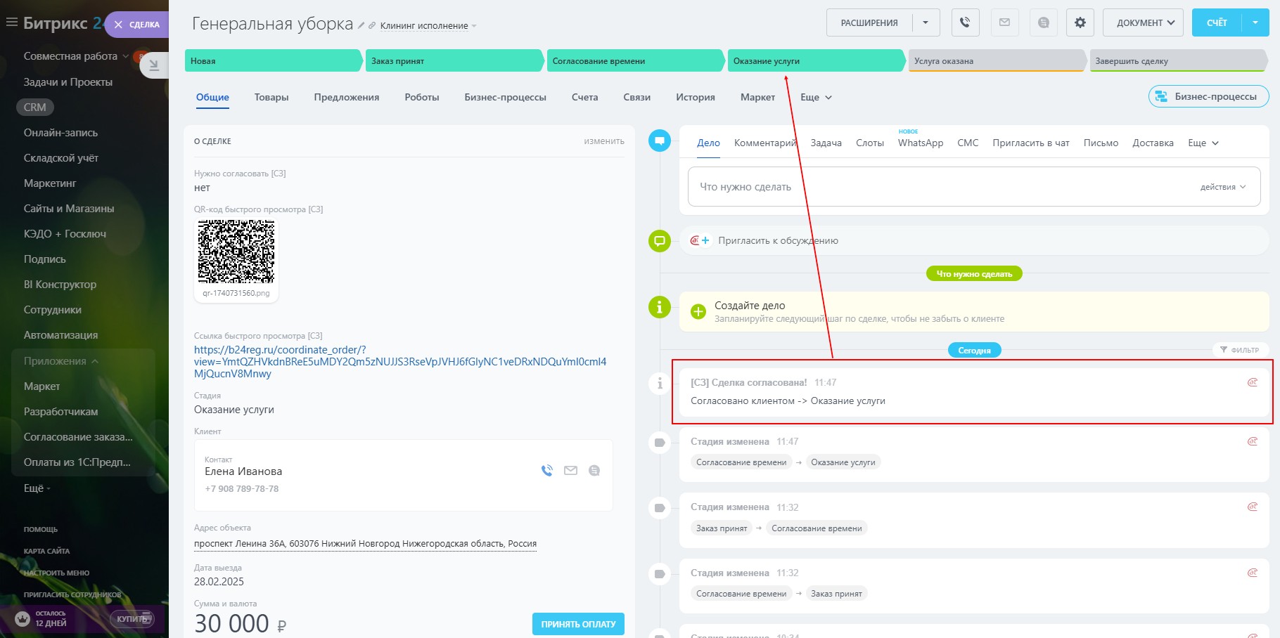 - Редактирование полей будет возможно, только если страница заказа (сделки) открывается в режиме Согласовать.